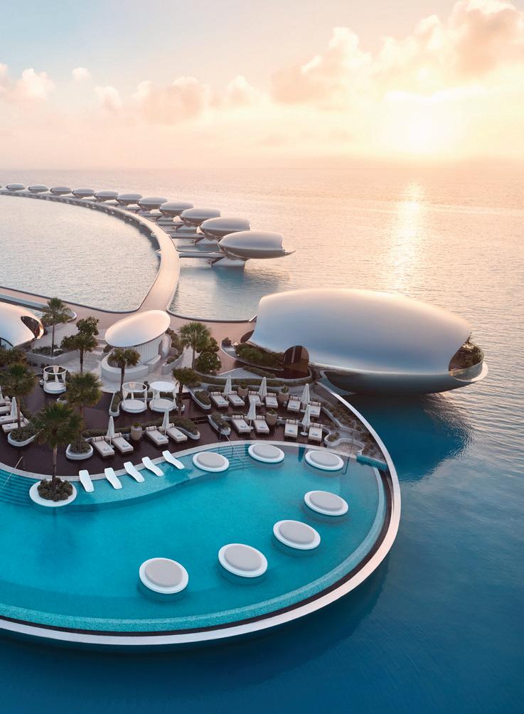 This page (from top) –The overwater villas linked in a graceful chain, appear as if floating on the sea; Rockwell leaned into aerodynamics and movement to create soft and tailored interiors; Rockwell crafted interiors that contrast the orbs’ sleek exteriors with soft, cocooning spaces