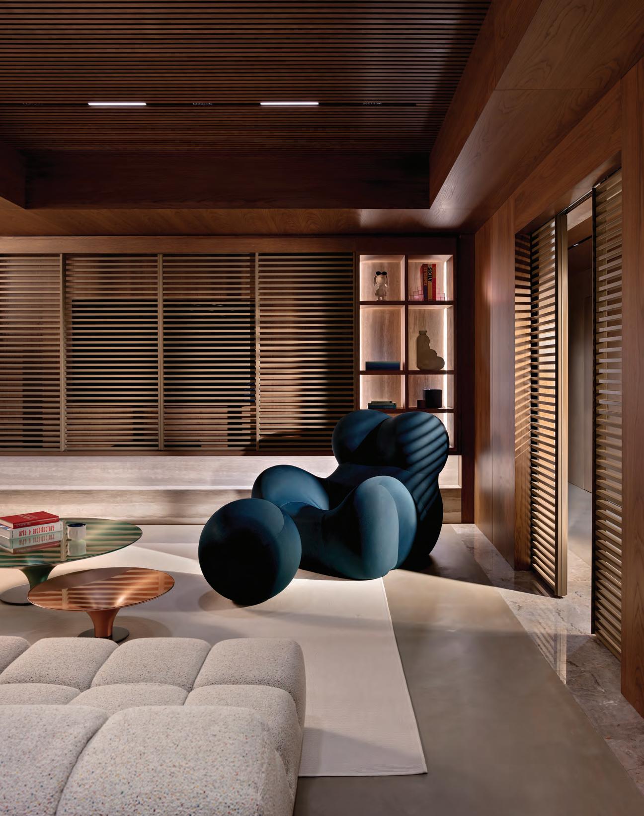 With a sizeable plot, the villa was positioned to maximise sea views. Spread across four levels, the ground floor is the heart of the home, featuring a majlis with large windows that frame the sea, invite natural light and provide outdoor access. The ground floor also features a second living area, a dining area and a dramatic double-height kitchen with a ten-metre-long island made entirely of Fior di Bosco marble, intersected by a Canaletto Walnut wood slab for the buffet table. Contrasting this visual landscape is a sinuous chandelier made of leather belts and LEDs, filling the upper field of view with its lightness and aerodynamics. The chevron marble floor patterns form the base of the imposing parallelepiped, creating a geometric interplay. There is also a dedicated formal workspace for the family, offering a tranquil space for focus, as well as two elegant guest suites with private bathrooms.