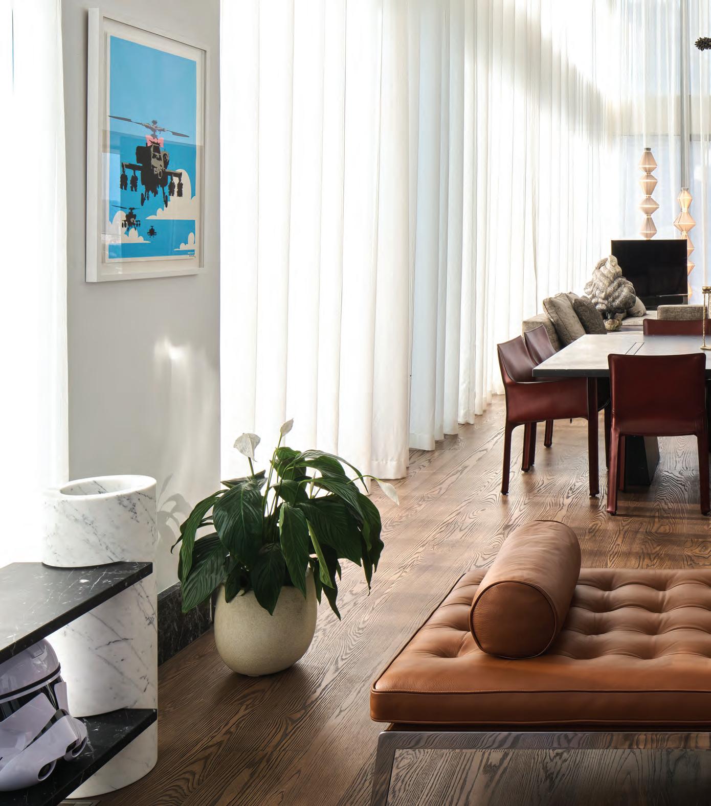 garde and often one-of-a-kind and create a meaningful dialogue with space, adding layers of personal expression. Each object, from tables to light pieces, was chosen not only for its aesthetic beauty but also for its ability to integrate with the interior and curatorial flow, crafting a narrative where art, design and living intersect. “The Client is of Asian descent and already had an extensive collection of Japanese, American and British pop-art.” Shares Ashmore. “This eclecticism gave us a mandate to look at the furniture, collectible pieces, lighting, and objects as a further expansion of their existing collection. We curated each room like an Art Director would curate a contemporary gallery. Each space would have one or two key anchor pieces and multiple focal points from which to experience the pieces.”