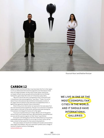 Nadine Knotzer and Kourosh Nouri may have been the first in the region to set up a dedicated international programme, but that doesn’t mean they are unapproachable. As they work at their desks, Hello Kitty on copper primed canvas sprayed with acid by Berlin artist Michael Sailstorfer, gazes down like some sort of business place deity. “We live in one of the most cosmopolitan cities in the world, and it should have international galleries,” says Nouri. “Today, if an artist doesn’t have international representation, he becomes a victim of his region and isn’t placed in the same pool as established artists. A [gallery’s] programme shouldn’t have a nationality.” Most of the artists that Carbon 12 represents live seas away from the raw Alserkal Avenue warehouse. The duo is on a mission to introduce these names to this part of the world, and have also been among the first pioneers to bring performance art to the region. “If you put on performance art in Paris, 80 per cent of the guests will be French, but in Dubai we’ll have 180 nationalities represented and you can see the surprise register on their faces,” says Knotzer. Everyone’s still talking about the time Anahita Razmi provocatively commanded audience members to cut scraps of a Gucci dress off her body, a shock to the system for the couture-obsessed city. This year Carbon 12’s booth at Art Dubai will include a never before seen flag by Sara Rahbar, who uses nationalist symbols and a collage of textiles to explore notions of belonging. carbon12dubai.com