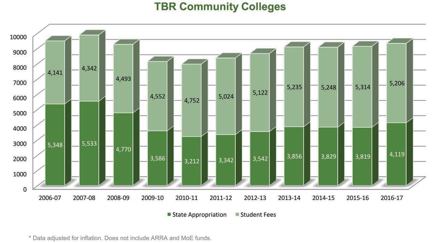 Student share of total revenue per FTE is defined as tuition and fees as a percent of total revenue from state appropriations and tuition and fees. Adjusted for inflation.