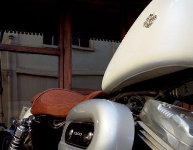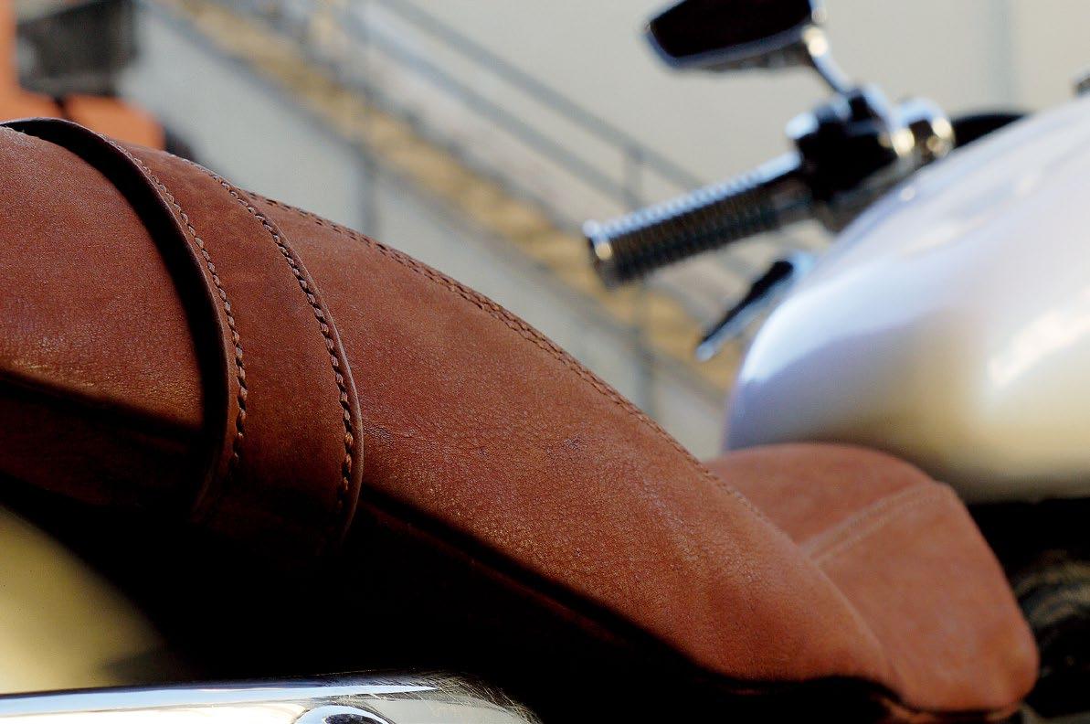 Pour ce qui touche à la moto, nous faisons principalement des habillages de selle. Nous travaillons très peu la mousse. Ici elle n’est pas assez dense. Royal Enfield, Harley, BMW… On commence à avoir quelques pièces qui circulent. Elles ont un caractère assez brut. Les gens aiment bien. Nous avons aussi réalisé quelques sacoches, trousse à outils, cache batterie et quelques habillages de poignées.