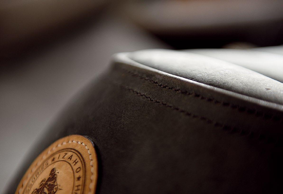 IZAHO parce que nous dessinons à la main, à l’équerre, au compas. Il n’y a que la main, le cœur et l’outil. C’est ainsi pour le patronage, la découpe, le parage, le collage, l’assemblage, le piquage, la finition de tranche, le bichonnage. Nos coutures sont, elles aussi, totalement effectuées à la main, au point de sellier.