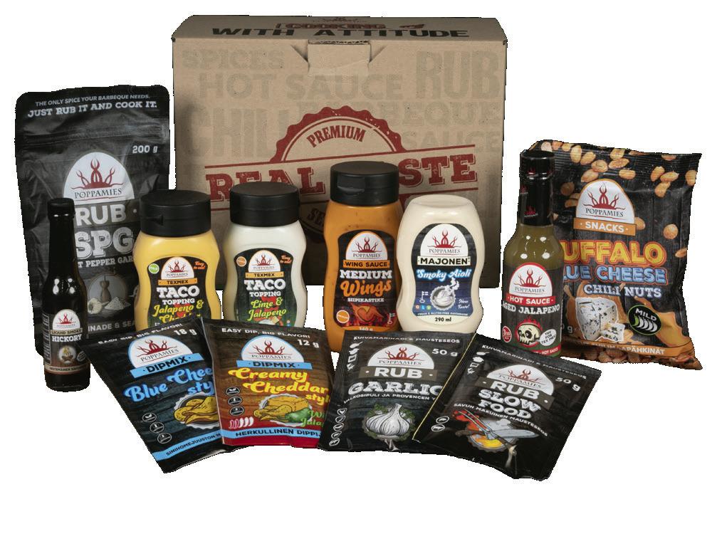 Maistuva, 12:n tuotteen valikoima mausteita ja kastikkeita.