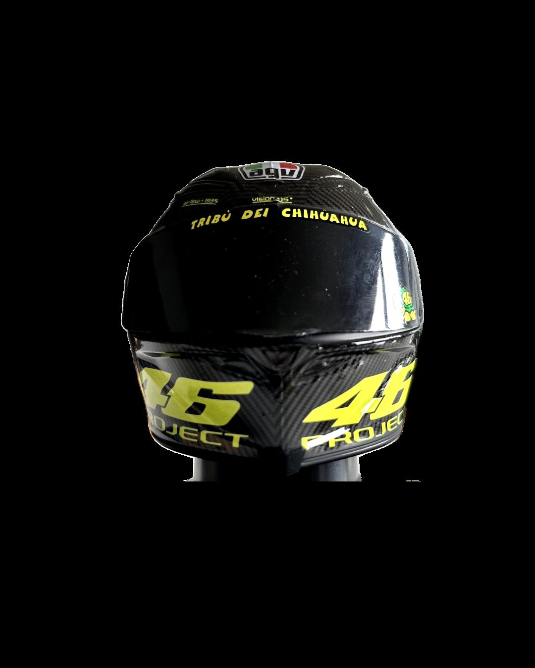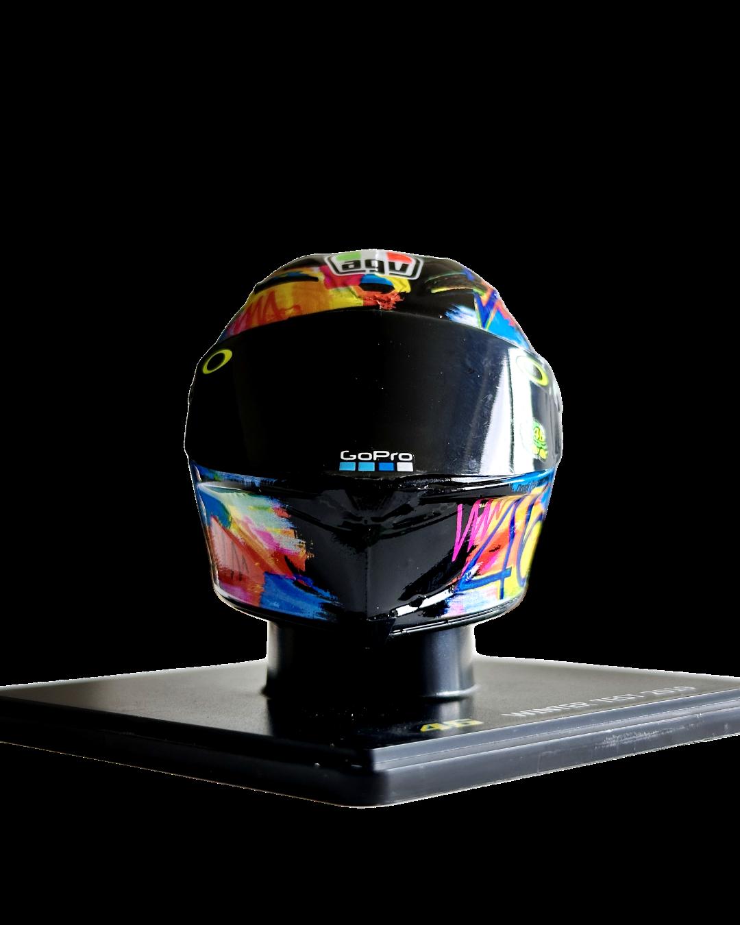 “El primer casco de la era de Rossi, el primer diseño inolvidable del Soleluna del Doctor. El AGV Q3 Pro (Professional) es la evolución del Q3 anterior, a su vez una evolución del Quasar, desarrollado junto a Wayne Rainey, e introdujo tomas de aire en forma de lágrima en la parte delantera y un extractor en la zona superior. La calota era una mezcla de fibra de carbono, fibra de aramida y fibra de vidrio. Fue el casco que acompañó a Valentino hacia sus primeros éxitos en 1996 y a su primer título mundial, en 1997. Además de la primera de las muchas versiones del Soleluna, recordamos la librea especial de Suzuka 1997.