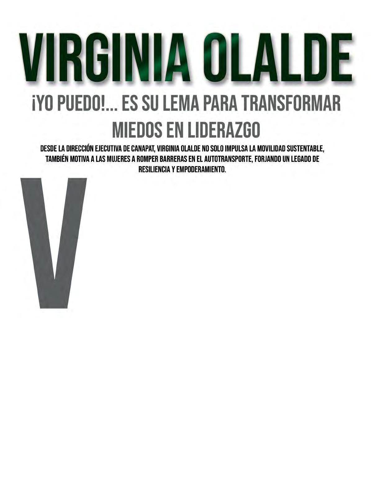 irginia Olalde López-Gavito, Directora Ejecutiva de la Cámara Nacional del Autotransporte de Pasaje y Turismo (CANAPAT), es un ejemplo de determinación femenina en un sector tradicionalmente dominado por hombres. Su trayectoria, marcada por decisiones estratégicas y coraje para enfrentar desafíos, se centra en el lema ¡yo puedo!, para vencer los miedos internos que, a su parecer, afectan tanto a mujeres como a hombres. Olalde inició su carrera con una visión clara: “Siempre he sido una persona de estrategia profesional, de ir trazando a dónde quiero llegar y qué pasos tengo que seguir para lograrlo”. Tras desempeñarse como Directora de Comercio Exterior y Estudios Económicos en la Asociación Nacional de Productores de Autobuses, Camiones y Tractocamiones (ANPACT), en 2025 asumió un nuevo reto en CANAPAT con un rol de liderazgo más amplio.