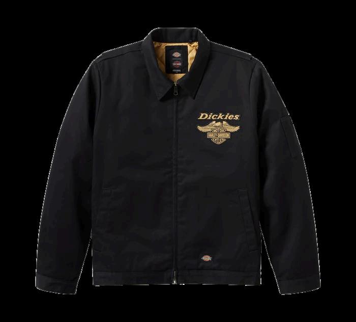 ThissignatureDickies® silhouettegetsaHarley-Davidson® upgrade.Madedurablefromaheavyweighttwillblend,the Dickies® xH-D® QuiltedLinedEisenhowerJacketisinsulatedfor addedwarmth.Itwiselyfeaturesanactionback,adjustable waistbandtabs,pre-curvedsleeves,andahiddensnap-down collarthatwon’tflaparoundunderridinggear.Finishedwitha contrastliningandcomplementing,co-brandedhardwareforan elevatedlook.Thismen’sjacketshowcasesdistinctivegraphics onbothsidesthathonortimelessstyleandahardworkingspirit. PartoftheDickies® xH-D® Collaboration