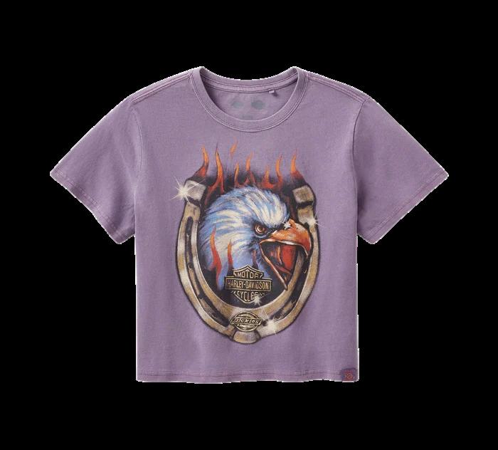 Bold,retro-lovingstylemeetslongwearingcomfortonthe Dickies® xH-D® FlamingEagleBoxyCropTee.Craftedfrom breathablecottonjerseyinaboxycroppedfitthat’sheavy pigmentwashedtogiveitauniquecolorandshadingvariation plusawell-wornlookandfeel.Theeye-catchingartworkonfront showcasestwobrandingstapleswiththeeagleforHarleyDavidsonandtheDickieshorseshoe.PartoftheDickies® xH-D® Collaboration