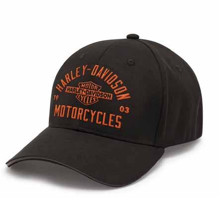 Harley-Davidson® Women's Essential Arched Font Ponytail Cap, 97708-25VW. Made from 100% cotton twill. Adjustable Adjustable branded metal slider. Contrasting sandwich brim. Elastic crisscross back panel. Twill applique applied with satin stitch embroidery. #97708-25VW