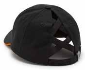 Harley-Davidson® Women's Essential Arched Font Ponytail Cap, 97708-25VW. Made from 100% cotton twill. Adjustable Adjustable branded metal slider. Contrasting sandwich brim. Elastic crisscross back panel. Twill applique applied with satin stitch embroidery. #97708-25VW