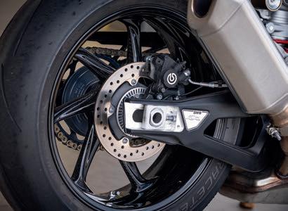 O sistema de freios da S 1000 RR M Carbon é muito eficiente. Na dianteira os dois discos de 320 mm mordidos por pinças radiais de quatro pistões são extremamente potentes e permitem frenagens insanas nas aproximações das curvas, e o freio traseiro oferece o equilíbrio necessário nas frenagens. O conjunto combinado com a bomba radial do manete não exige muita força para sentir as pinças trabalhando com pegada firme, potência e muita progressividade.