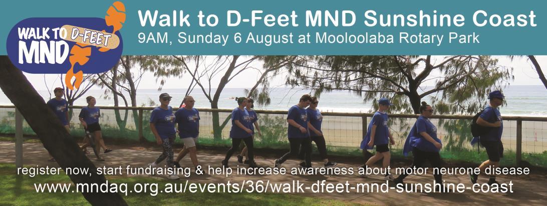 6 Aug - Walk to D-Feet MND Sunshine Coast, from 9AM at Mooloolaba, Register www.mndaq.org.au/events/36/walk-dfeet-mnd-sunshine-coast