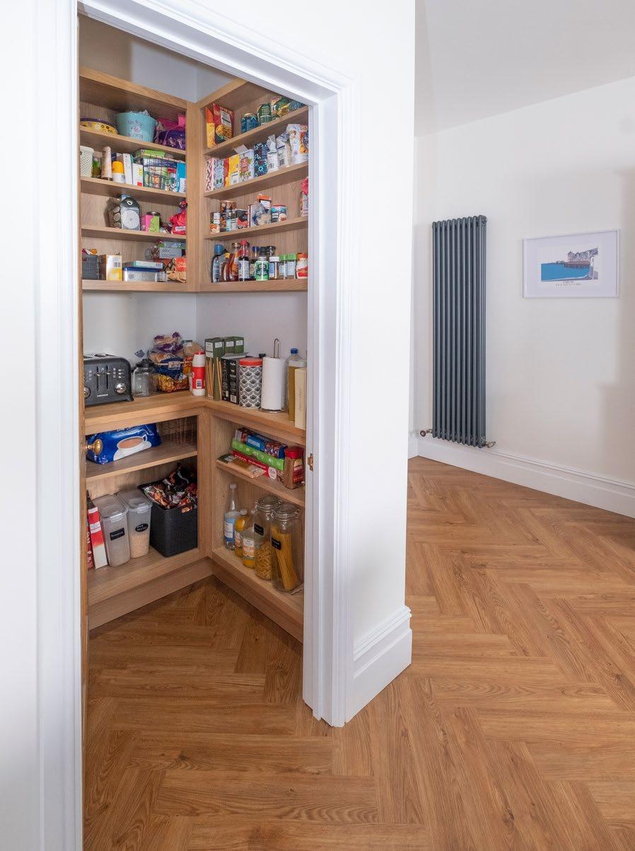A small cupboard, that was originally accessed from the hallway behind, was opened up on the kitchen side, fitted with a matching period door which created a bespoke walk in pantry for ample dry food storage, all finished in oak to pick up the colour of the warm herringbone floor used throughout the space.