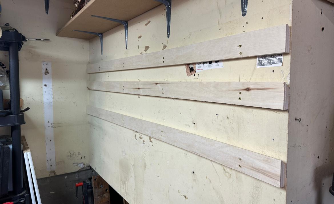 While that all sounds very easy, real life can throw you a curveball. In my case I was not starting off with a brand-new installation. On one side of the shop, I had to plan and design the French cleats to go around an existing electrical installation I did many moons ago. Looking at the attached photo from the other side of the shop you can see how much cleaner this installation is. But if your garage walls are built anything like mine, they are not straight and plumb. That can cause a problem if you are mounting anything that is wider than 12 inches or so. Because the wall mounted cleat is curved, the storage side cleat requires the same curve for the 45° sections to interlock properly. I actually found that keeping the storage side cleat assemblies
