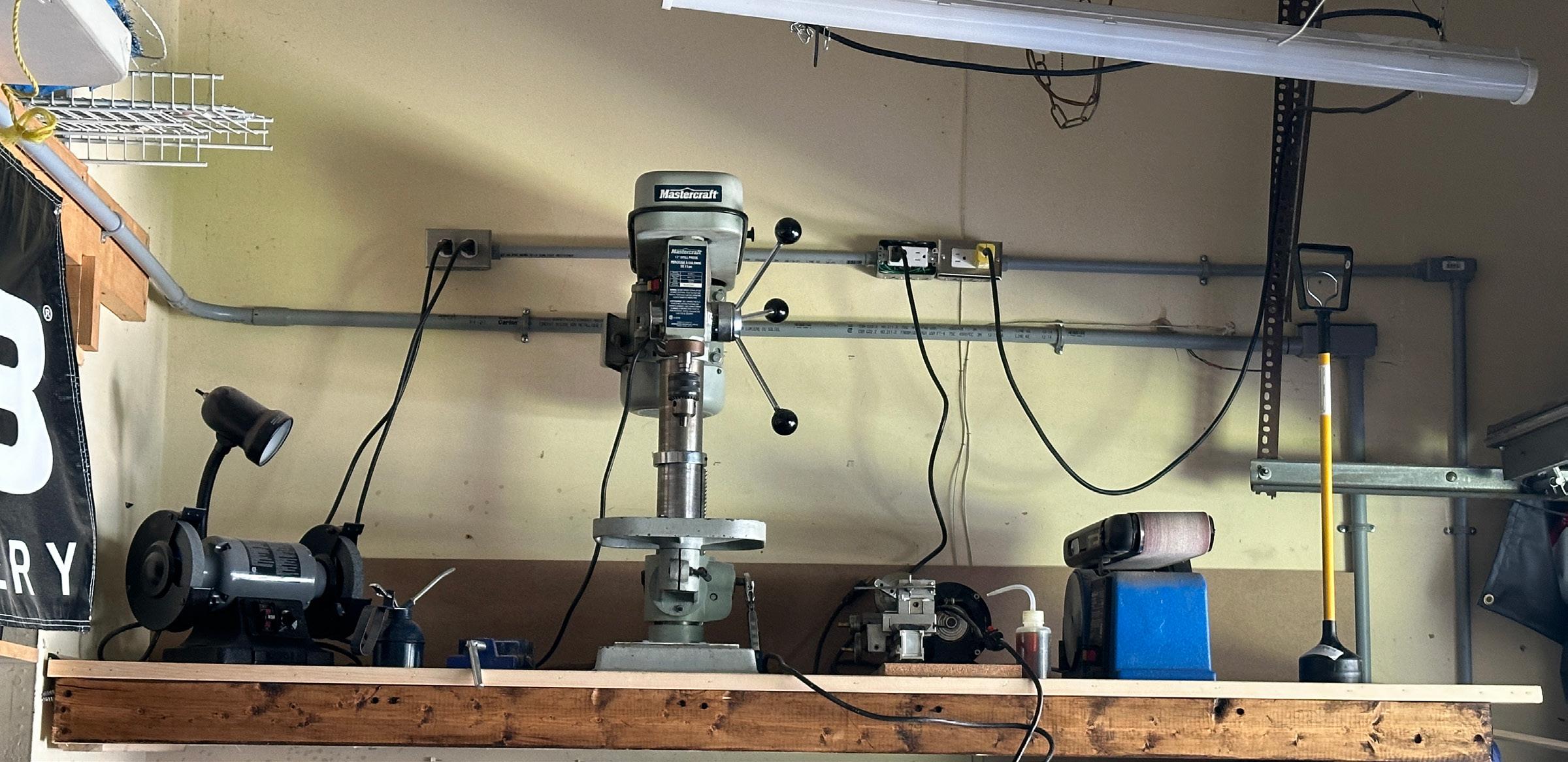 After much chin scratching and pulling of hair (something I cannot afford to do) I looked at turning the area above my resin storage racks into a mezzanine workshop. The top shelves were removed, and I built a bench top made from 2x4s covered in MDF to replace them. I ran some PVC conduit and installed a couple of 2 gang 120V receptacles to power everything.