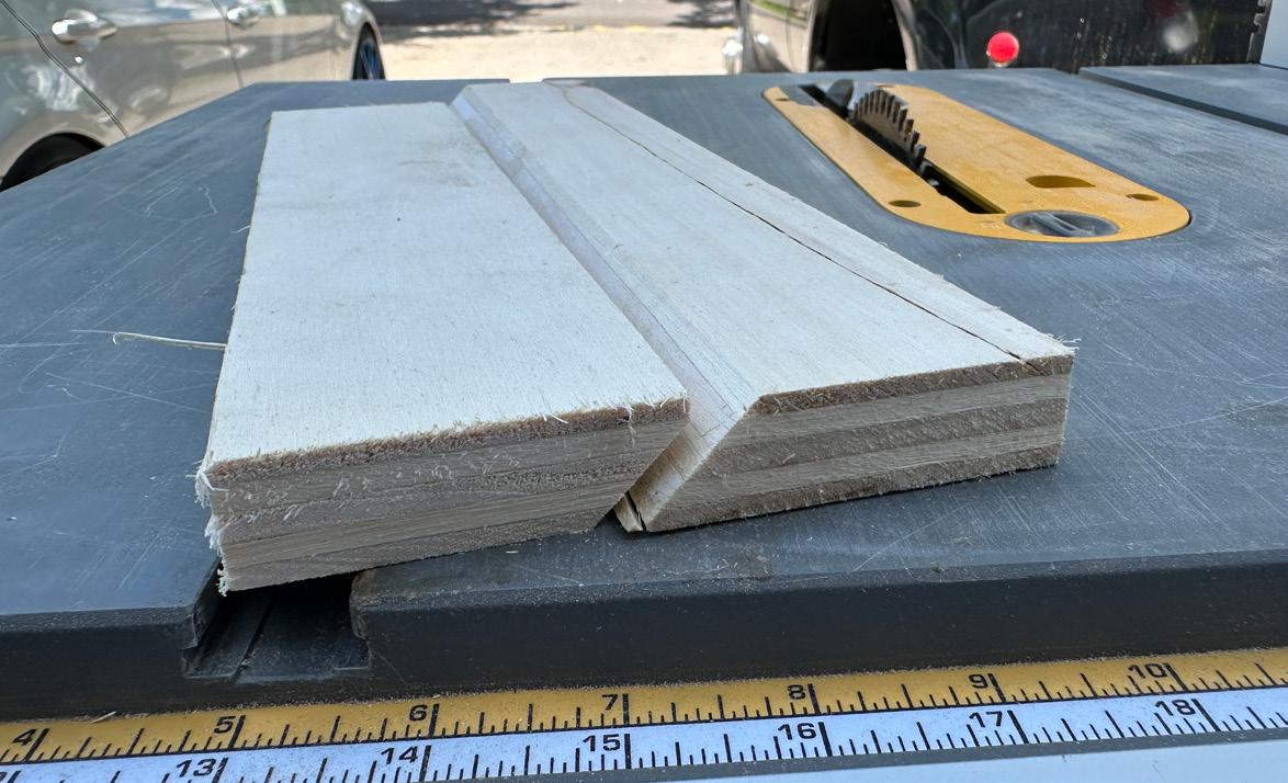That brings us to our next question, what exactly is a French cleat? It consists of two lengths of plywood, in our case three quarter inch thick. We took a 5 inch by 8-foot length and cut it in half with