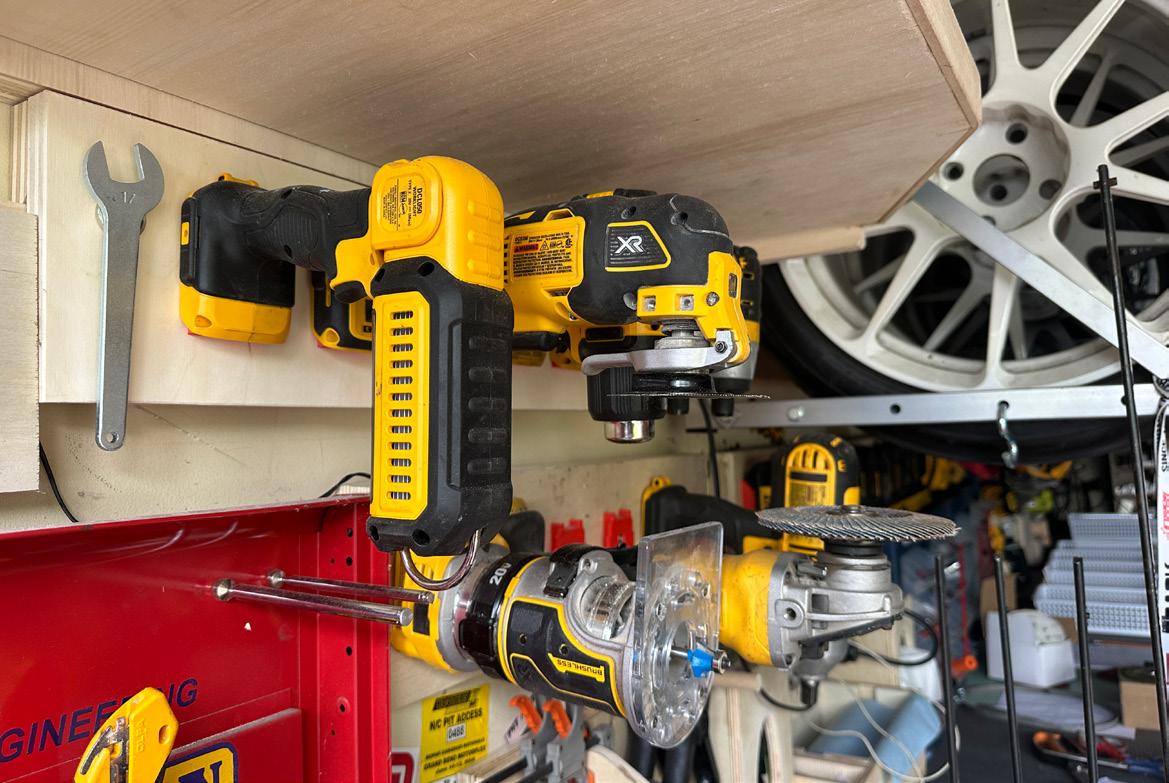 back showcasing how we stored our DeWalt cordless tools, batteries and four-gang charger. That previous storage idea took up a bunch of space close to the work top of the bench and it would be good to reclaim some of that space. By attaching the 3D printed mounts to a free French cleat, all of these tools are now tucked up out of the way, but easily accessible in space that was previously doing nothing. Of the tools I own, my one hand clamps tended to be just thrown into a drawer, it was not easy to organize them, so I searched the myriads of French cleat solutions on YouTube to figure out the best way to store them. And unsurprisingly there
