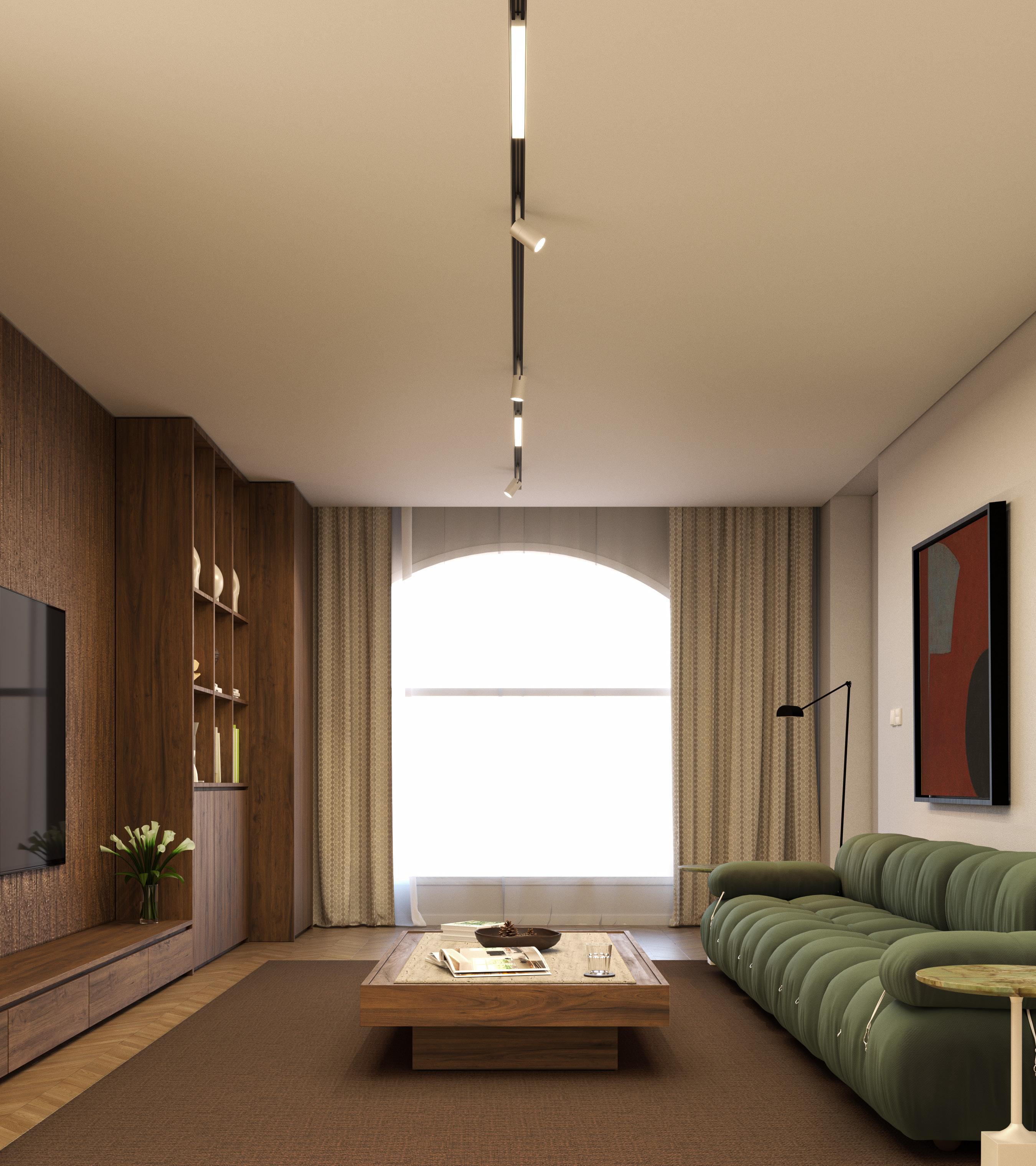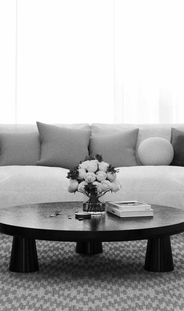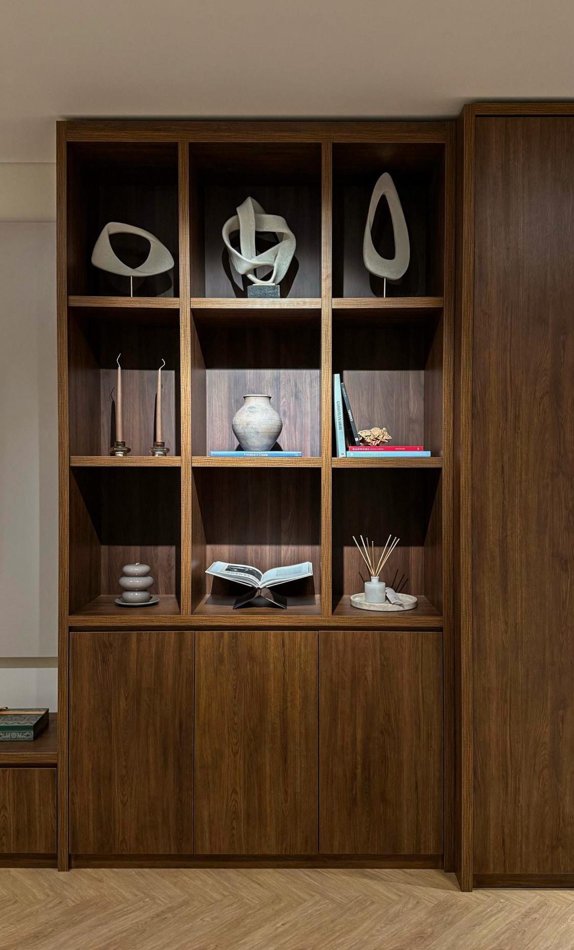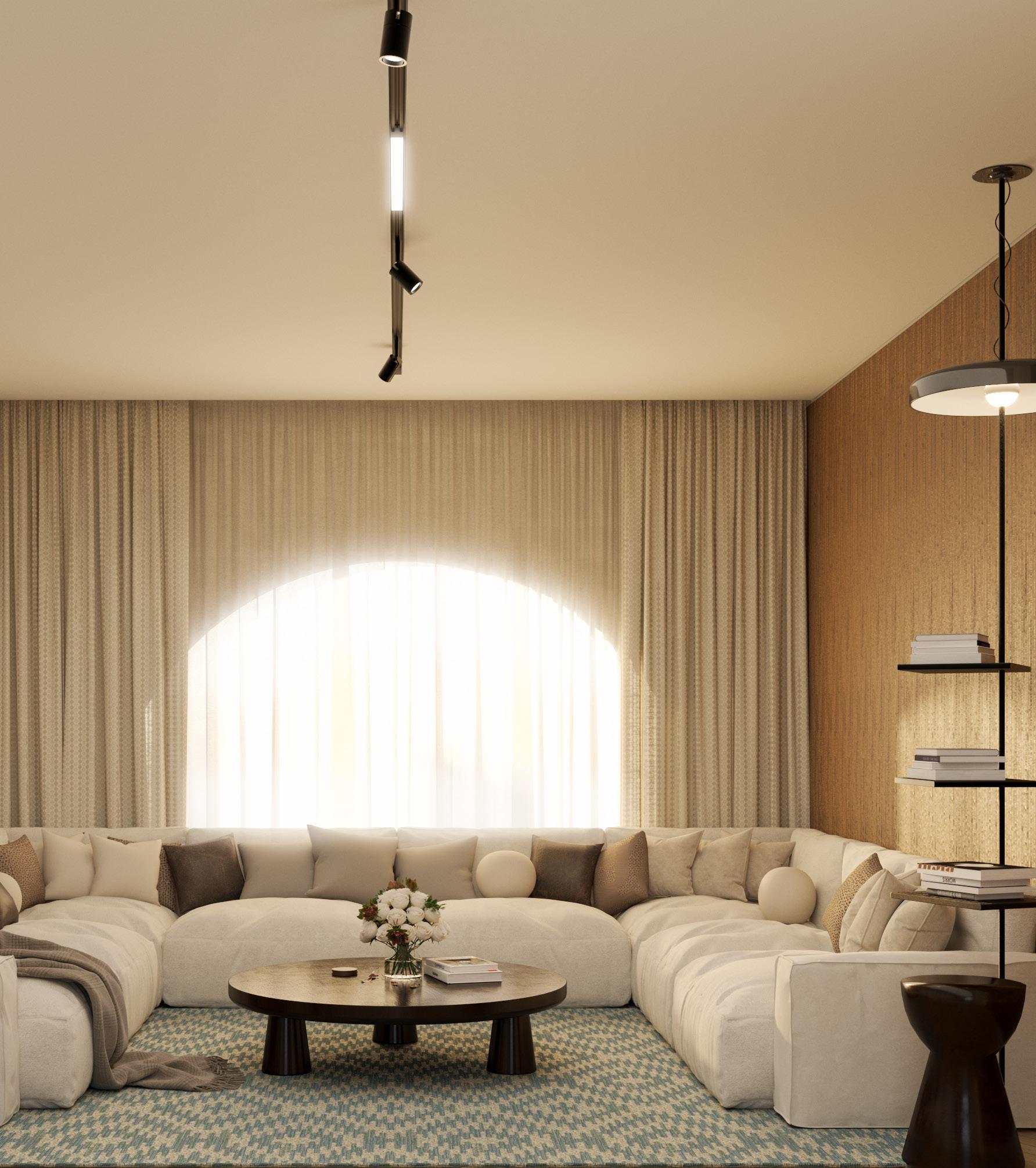 The furniture was thoughtfully selected to reflect the client’s aesthetic preferences, with several pieces custom-designed to meet specific functional and spatial needs, such as the U-shaped couch, wooden cabinets, and coffee corner.