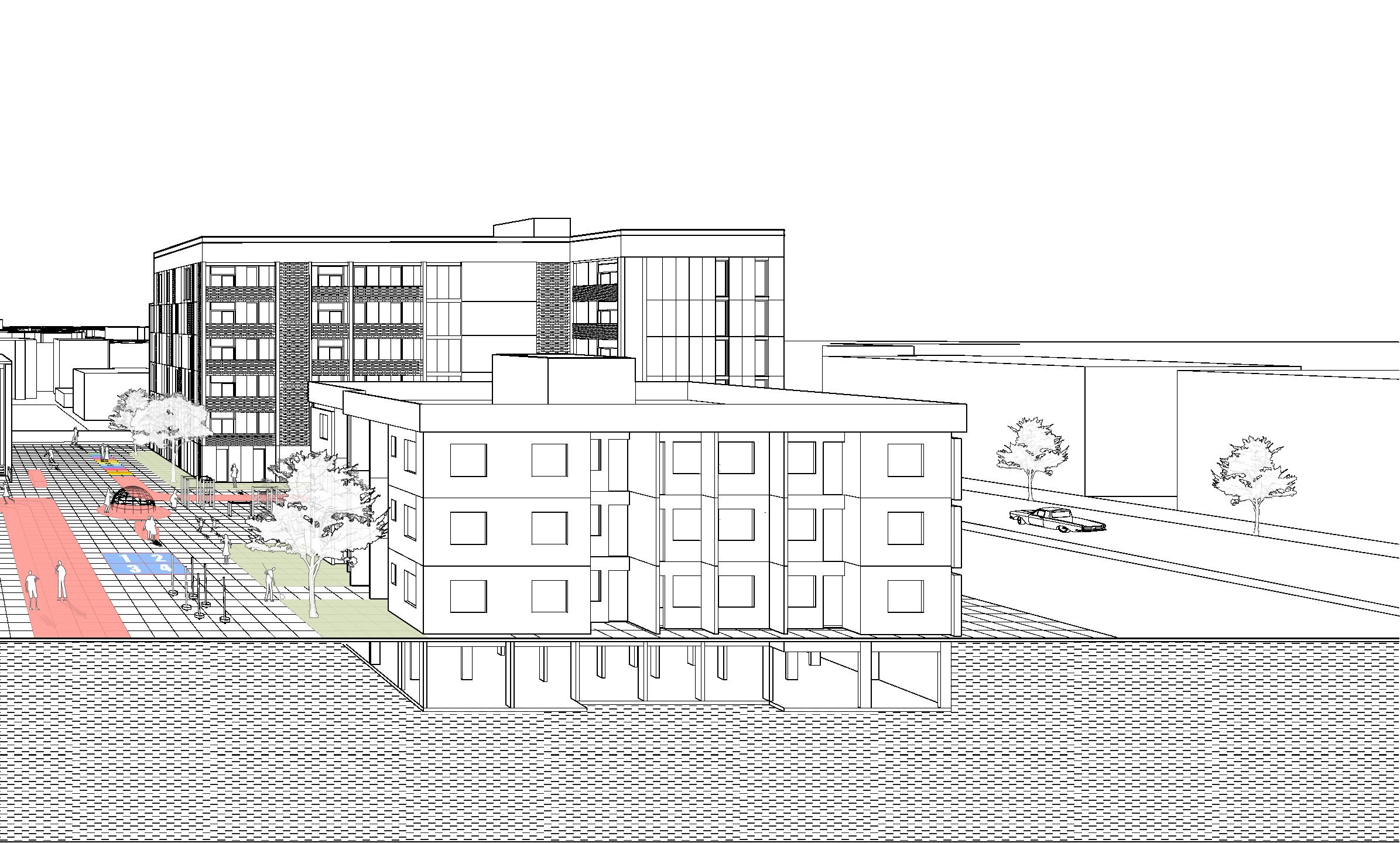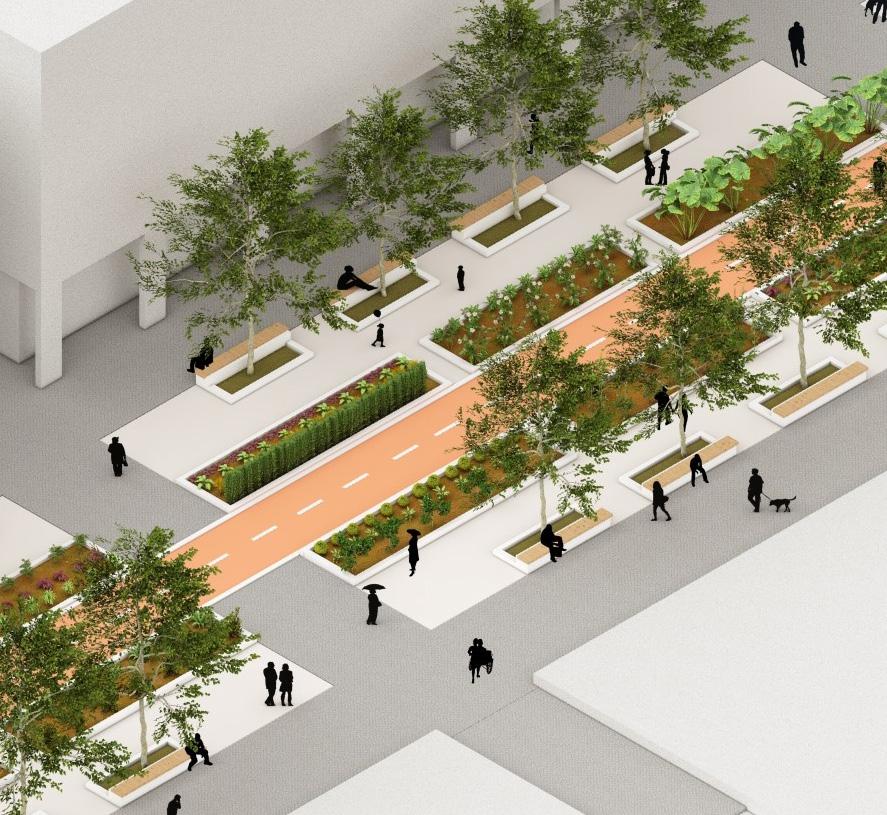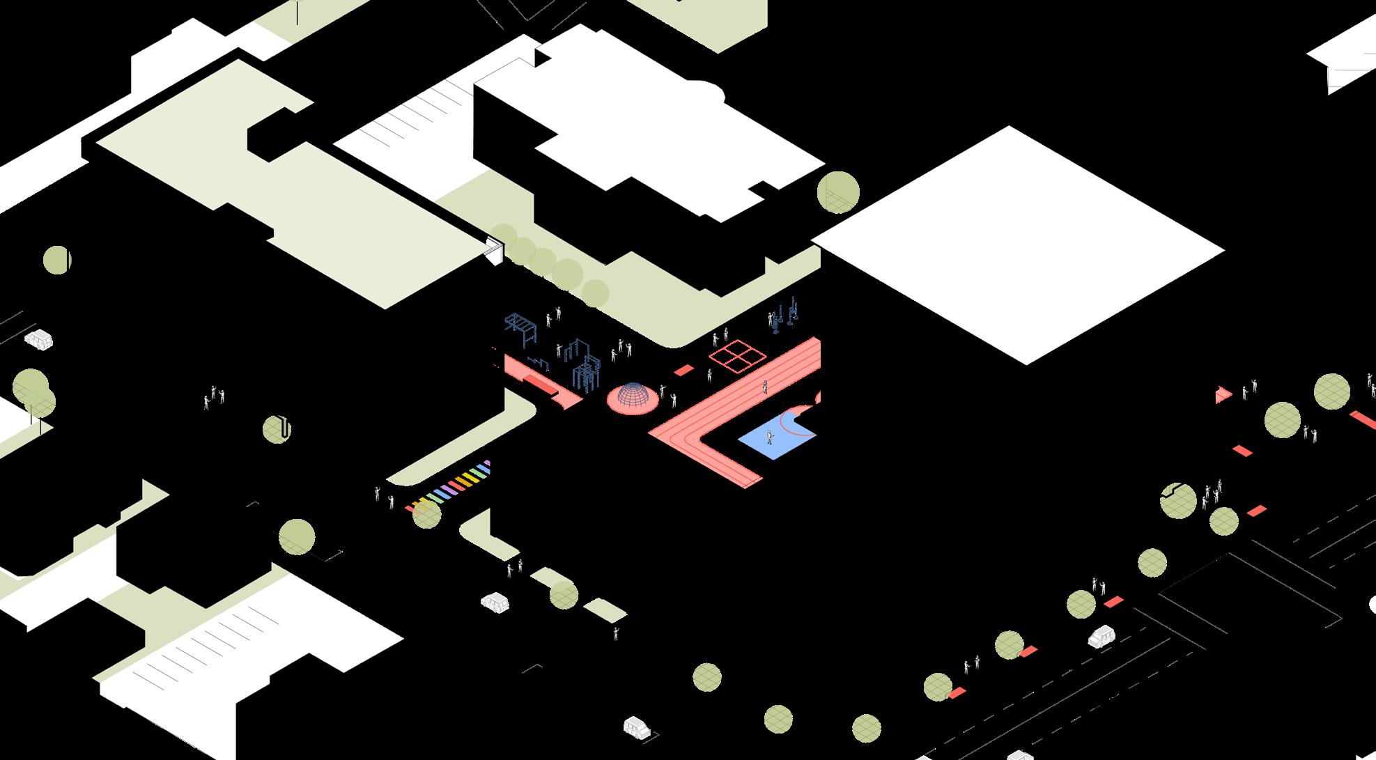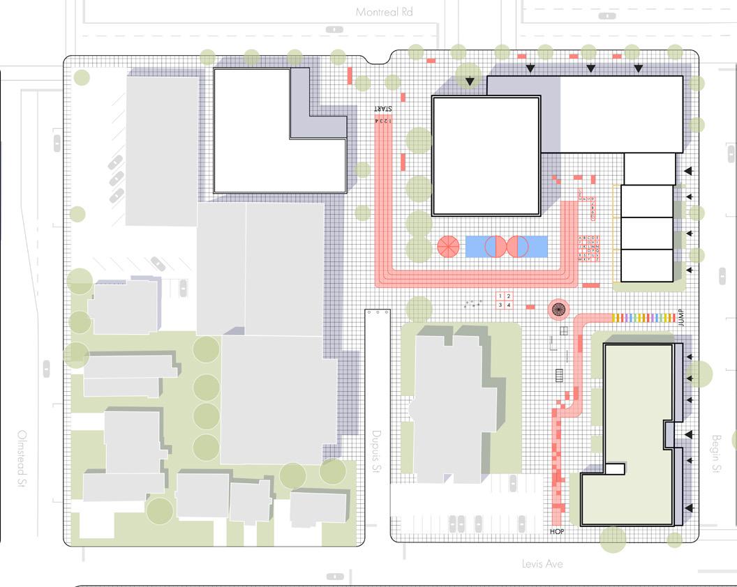 The open space is characterized by vibrant pavement, designed to be flexible and adaptable. The calisthenics bars offer a place for both kids and adults to utilize. This space is designed for the public and the community to create a lively and safe environment. Second Place Hobin Prize Winner