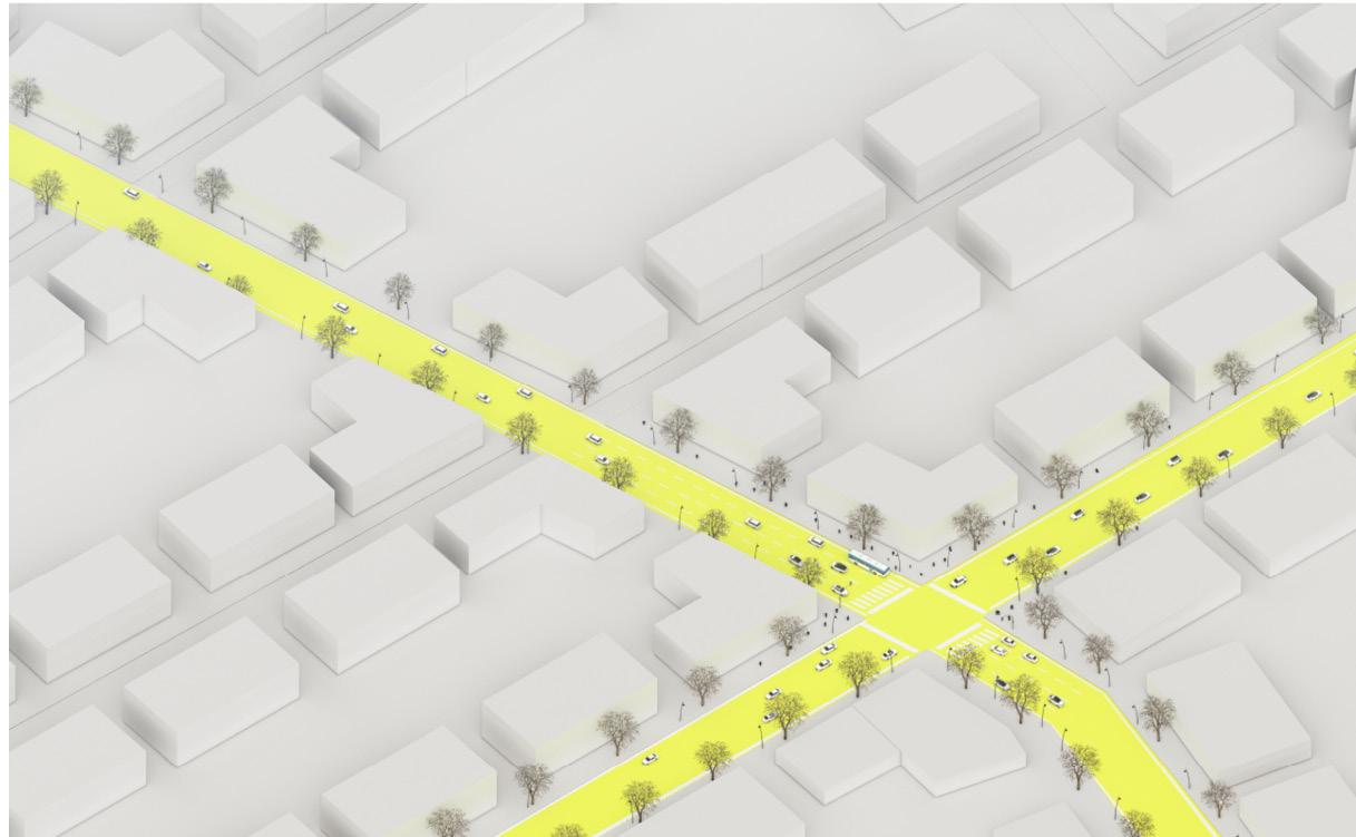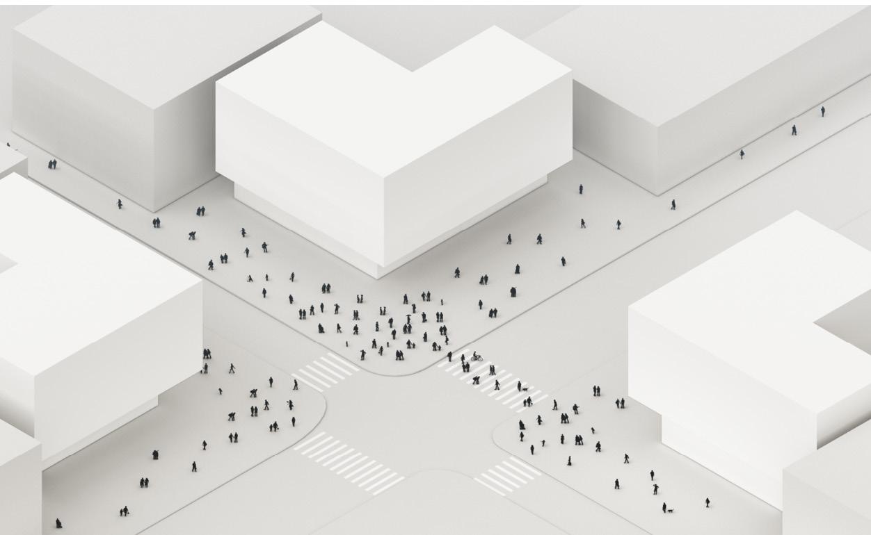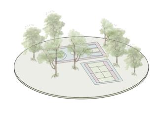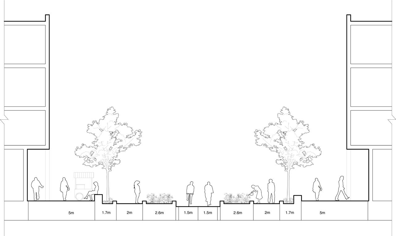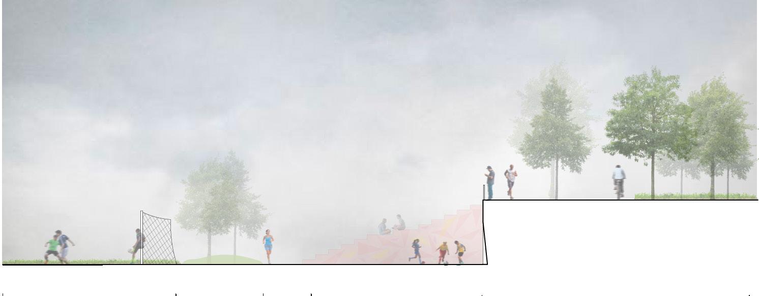 The open space is characterized by vibrant pavement, designed to be flexible and adaptable. The calisthenics bars offer a place for both kids and adults to utilize. This space is designed for the public and the community to create a lively and safe environment. Second Place Hobin Prize Winner
