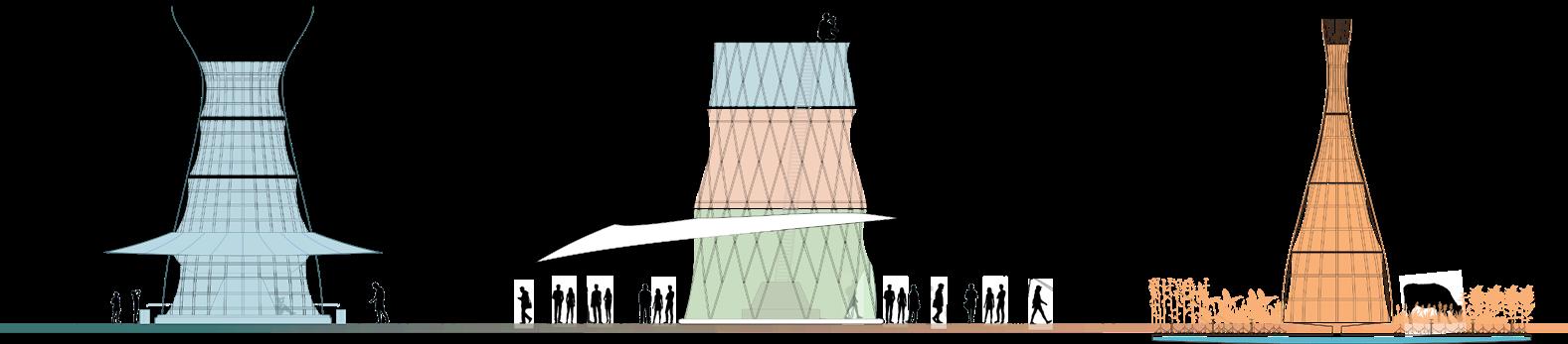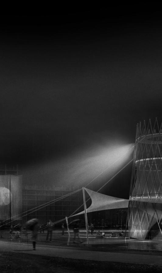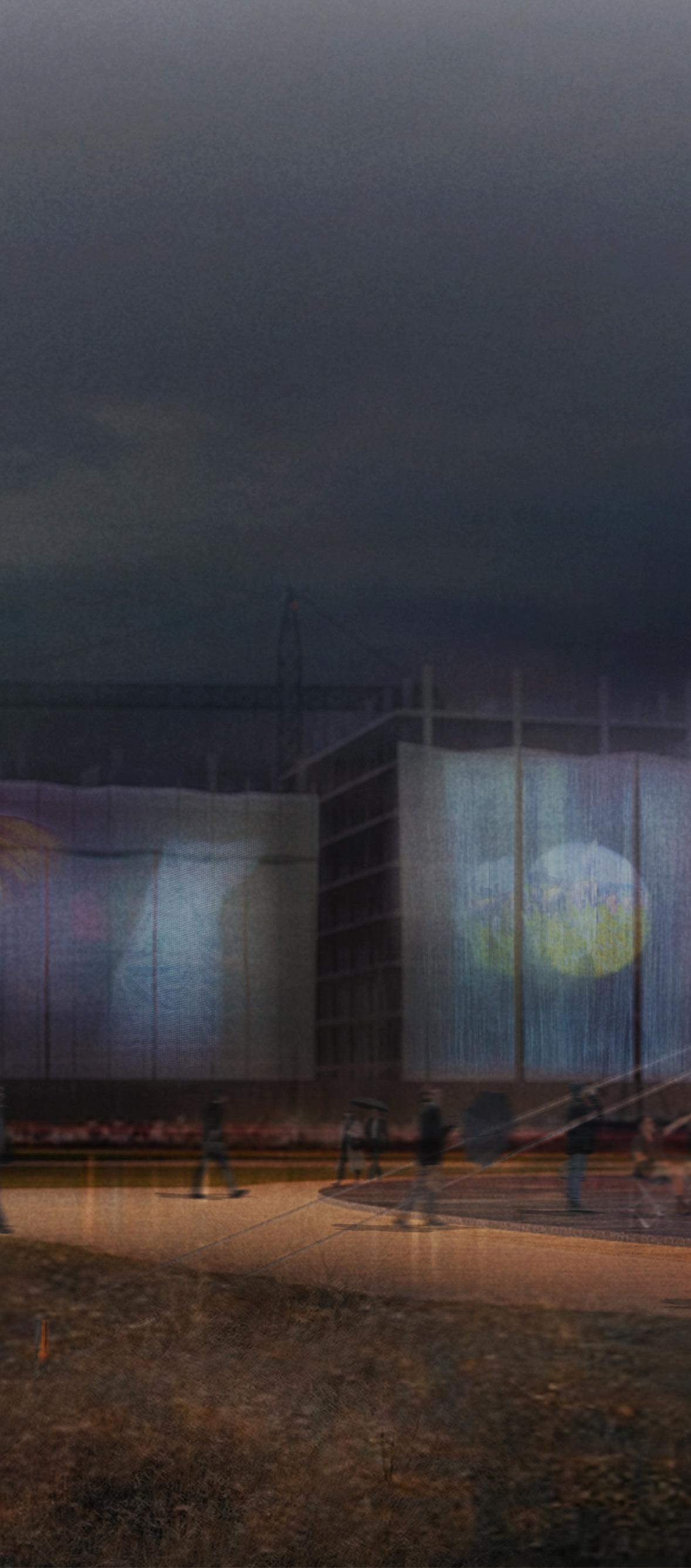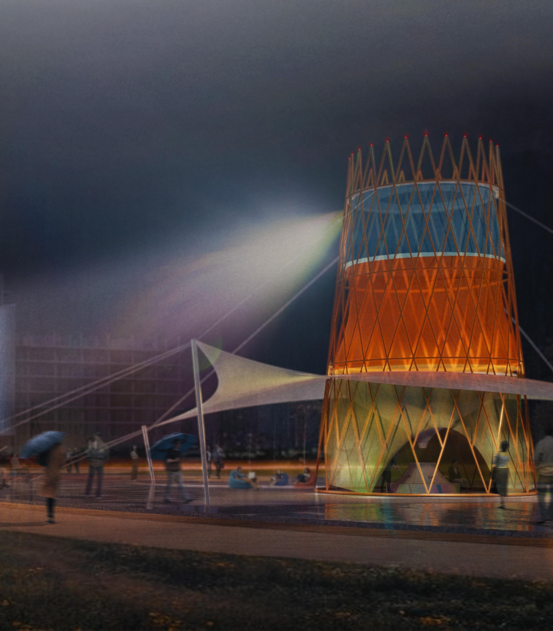 The project features several ‘Warka Water’ structures, strategically placed as nodes that connect different programming on the site. These structures also serve a community market, which offers an additional venue for activism through light projections that raise awareness by projecting images onto the construction sites.
