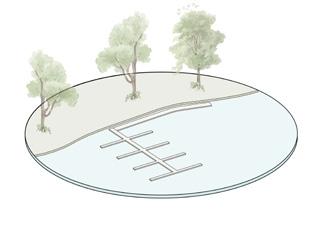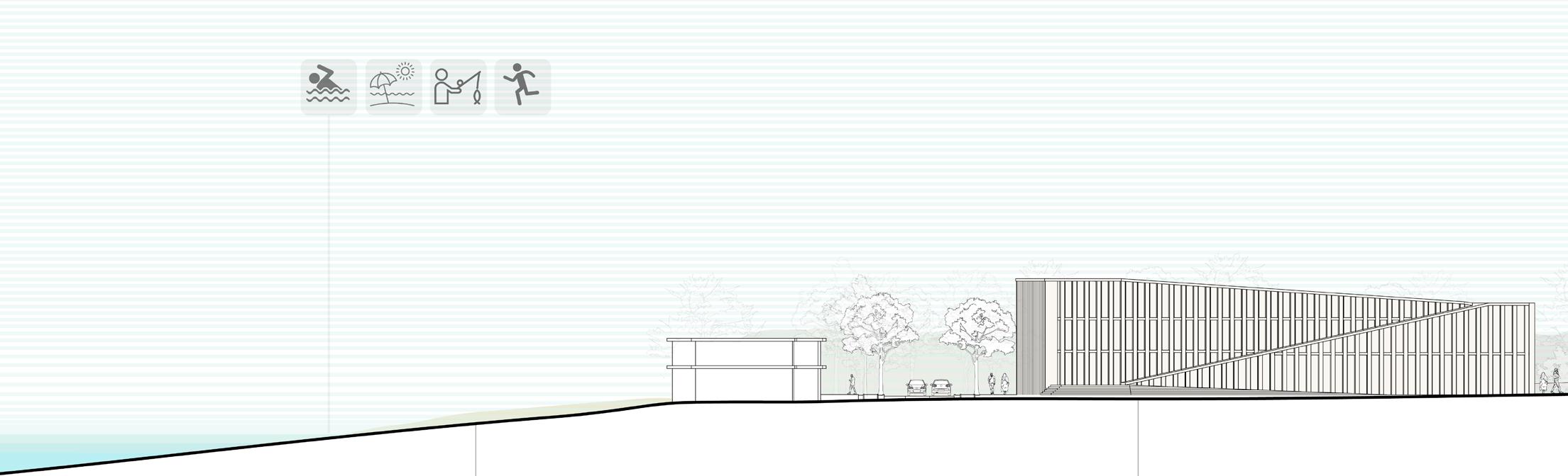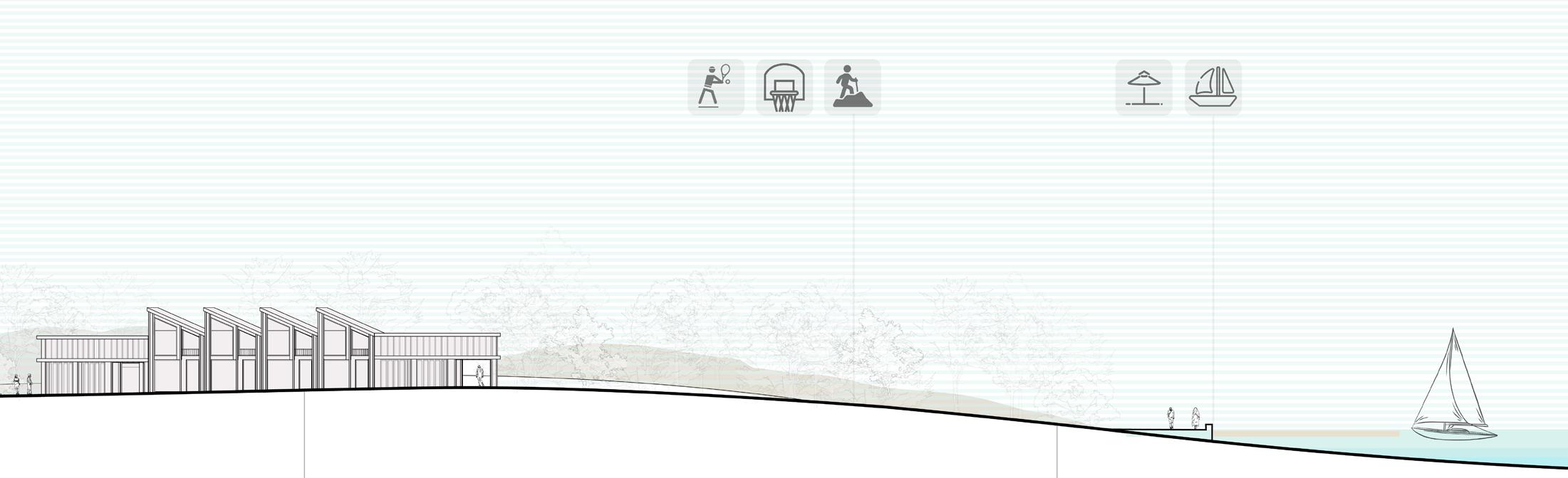Mobility is optimized by strategically placing the dock and walking paths to naturally guide visitors to key community hubs. These include a beach, a library, and outdoor recreational spaces.