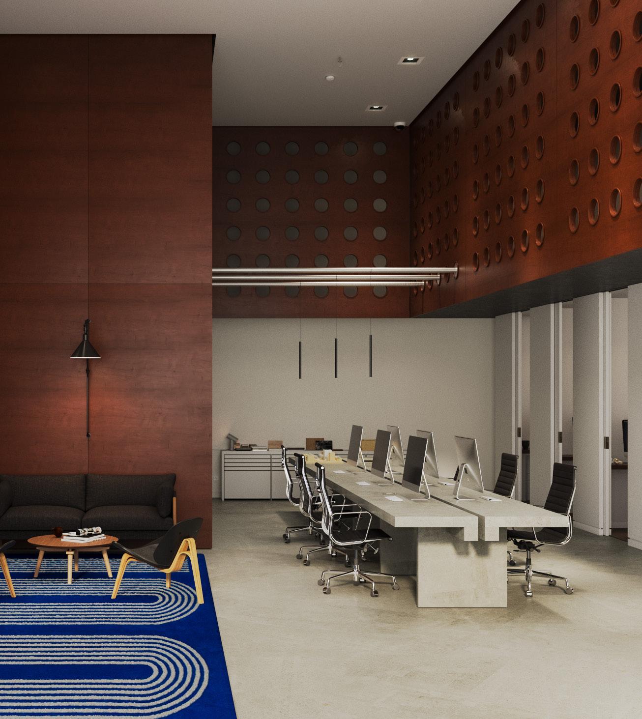 The client was presented with two distinct concepts, each offering unique styles and spatial configurations to support the dynamic workflow of design-focused teamwork. The selected concept merges mid-century modern aesthetics with Bauhaus principles, resulting in a refined and functional workspace. The project is currently under construction and scheduled to open in the second quarter of 2025.