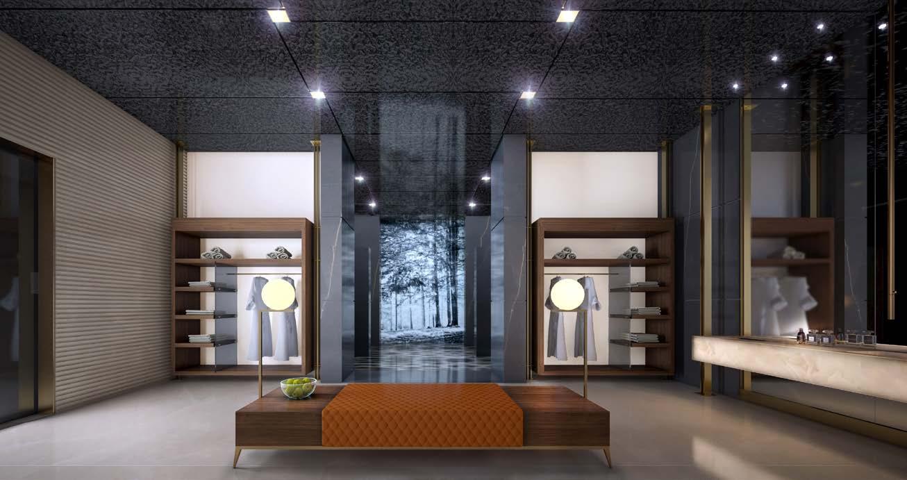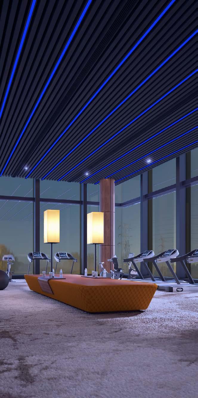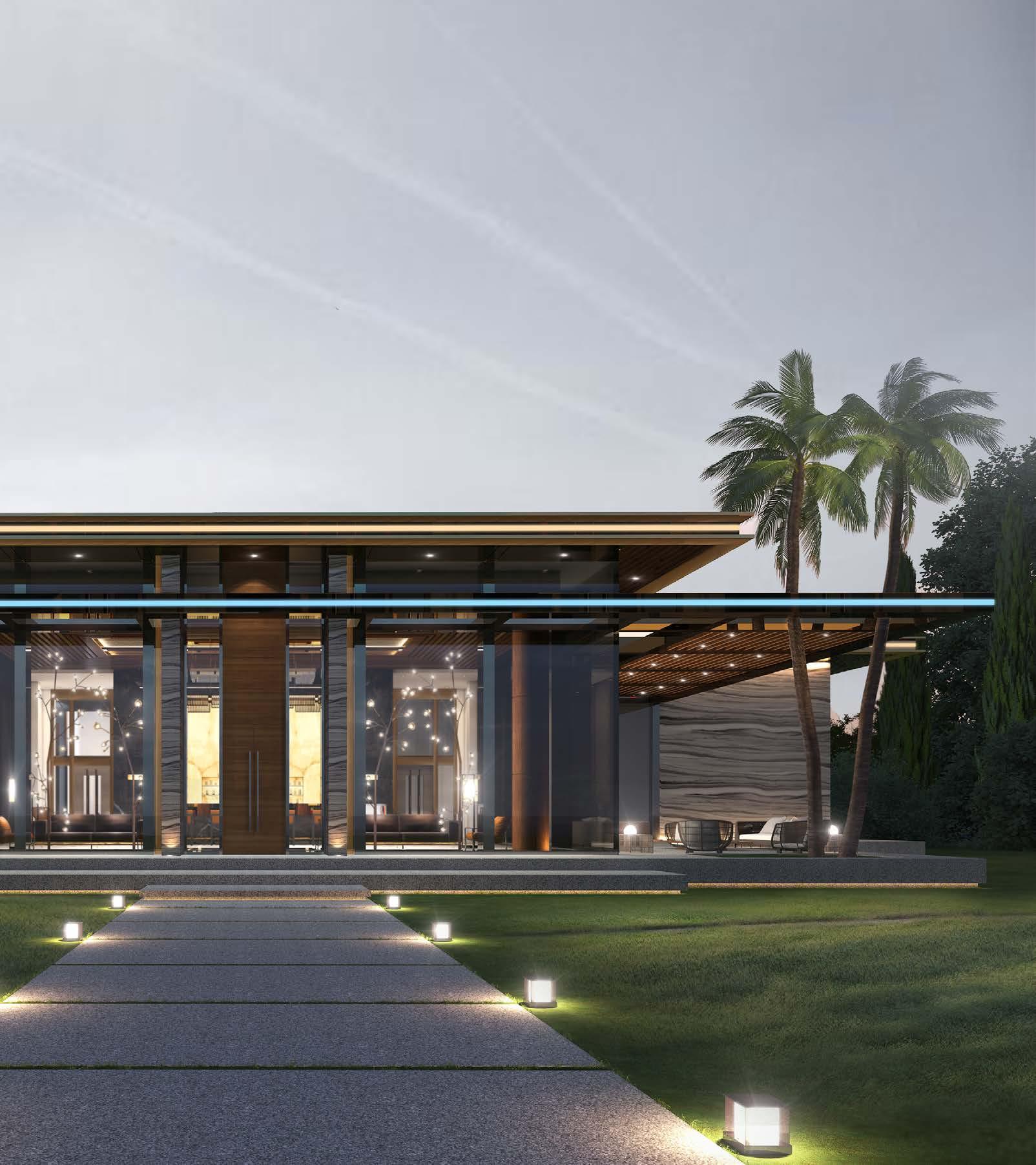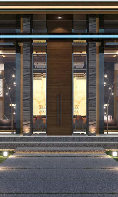 The Pavilion’s layout encompasses a range of luxurious amenities, commencing with an elegant foyer featuring a bar and lounge. Additionally, the design incorporates a state-ofthe-art gym equipped with high-end equipment for the ultimate exercise experience. The exterior landscaping is thoughtfully curated, showcasing a diverse array of local trees and vegetation, including the iconic date palm trees.