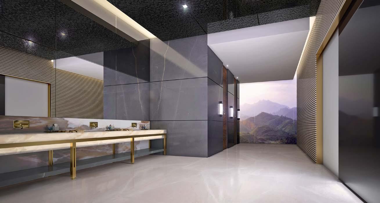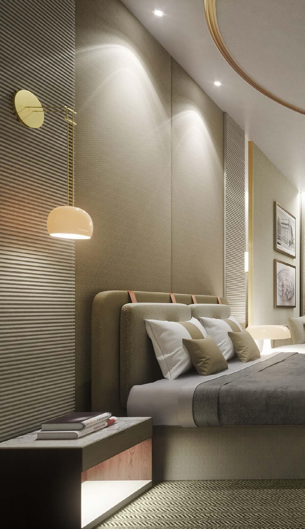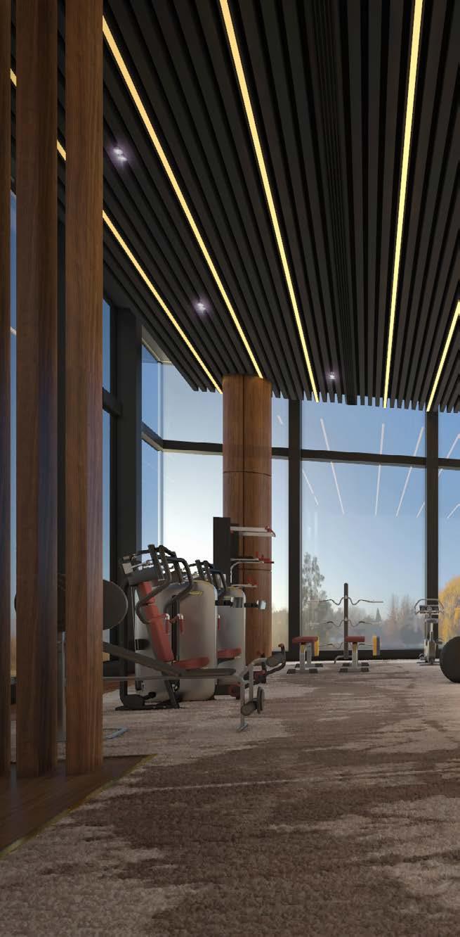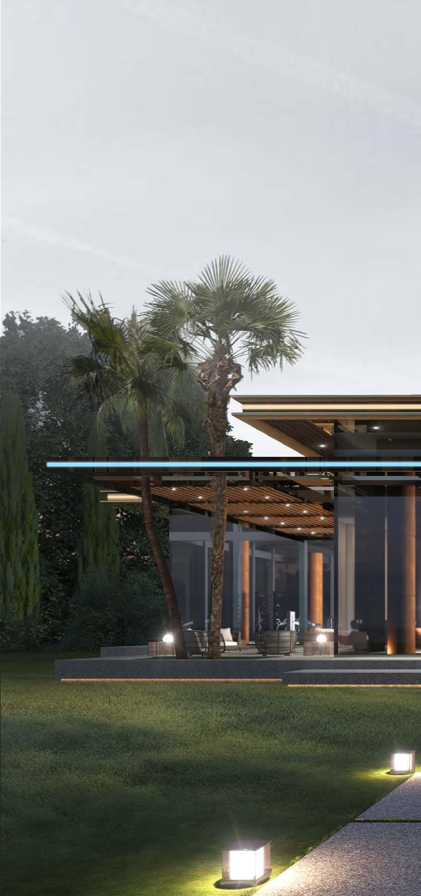 The Pavilion’s layout encompasses a range of luxurious amenities, commencing with an elegant foyer featuring a bar and lounge. Additionally, the design incorporates a state-ofthe-art gym equipped with high-end equipment for the ultimate exercise experience. The exterior landscaping is thoughtfully curated, showcasing a diverse array of local trees and vegetation, including the iconic date palm trees.