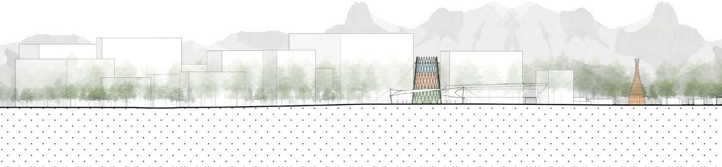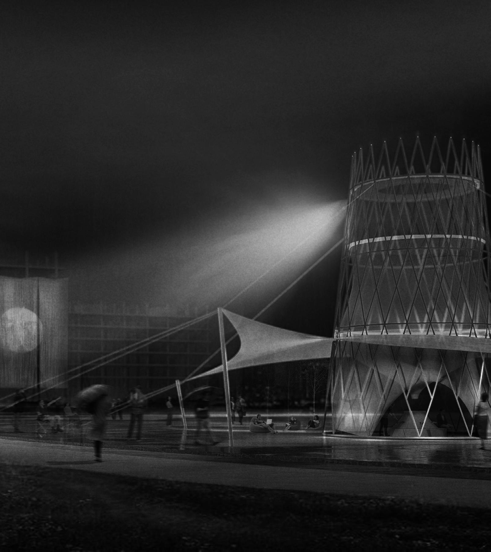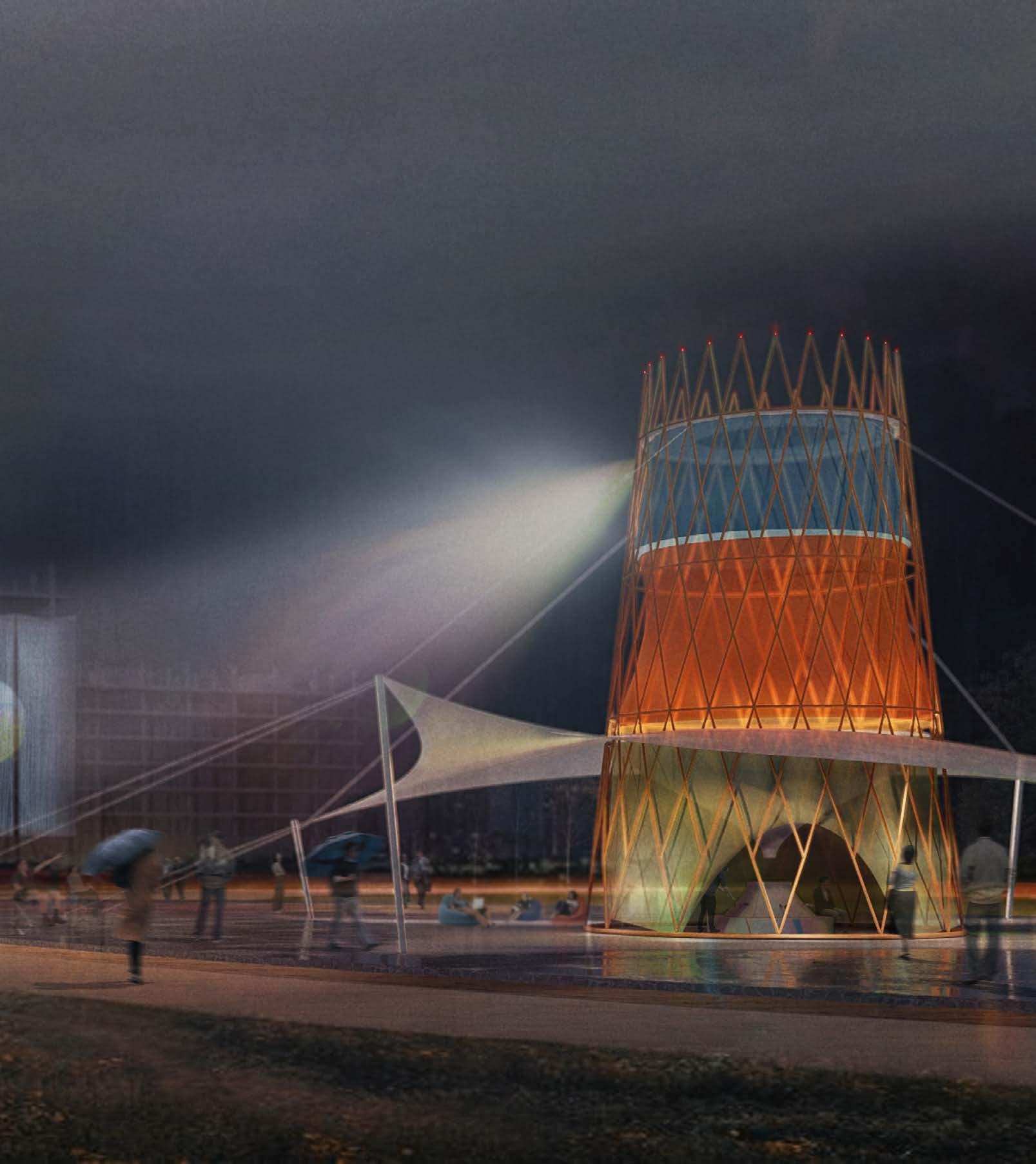 The project features several ‘Warka Water’ structures, strategically placed as nodes that connect different programming on the site. These structures also serve a community market, which offers an additional venue for activism through light projections that raise awareness by projecting images onto the construction sites. By prioritizing the needs of the current residents and their communities, the project uses architecture as a tool for activism.