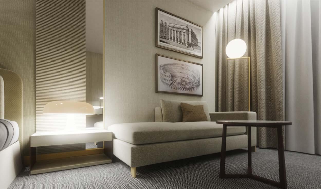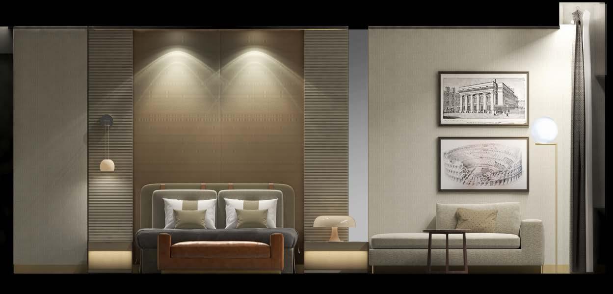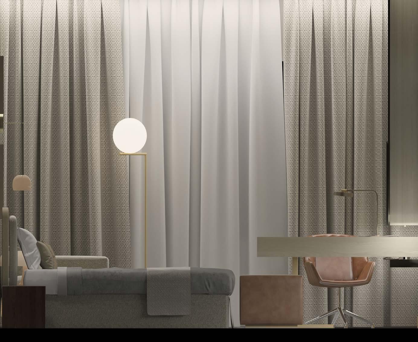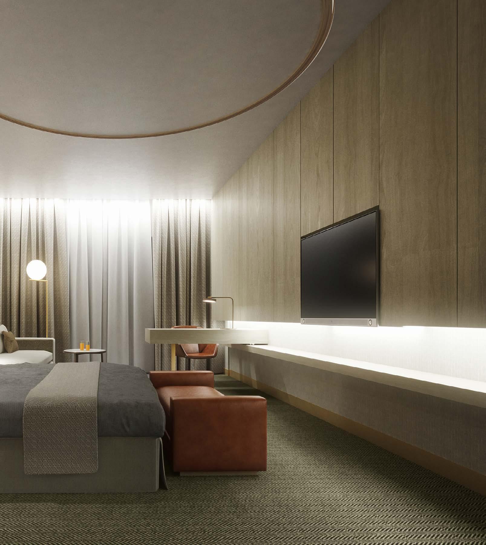 Situated within the newly developed city of Lusail in Qatar, this conceptual hotel room serves as an exemplary model layout designed for the upscale hotels rapidly emerging in 2021. The thoughtfully curated layout maximizes the efficient use of space, strategically placing all essential accommodations within the confines of a compact area.