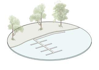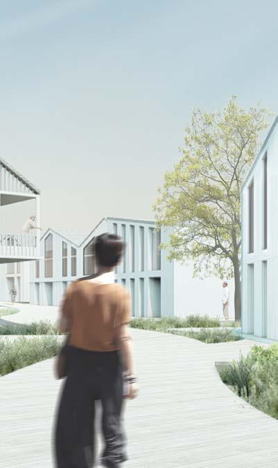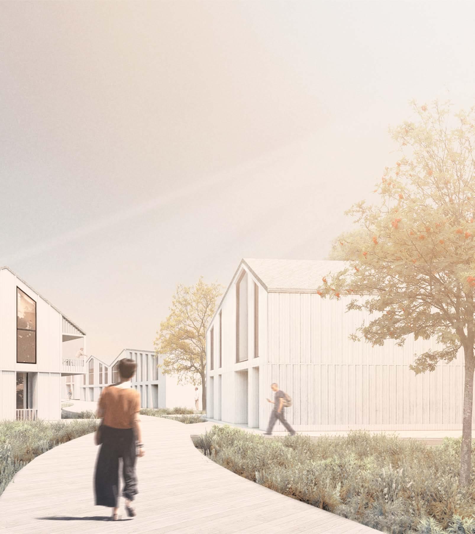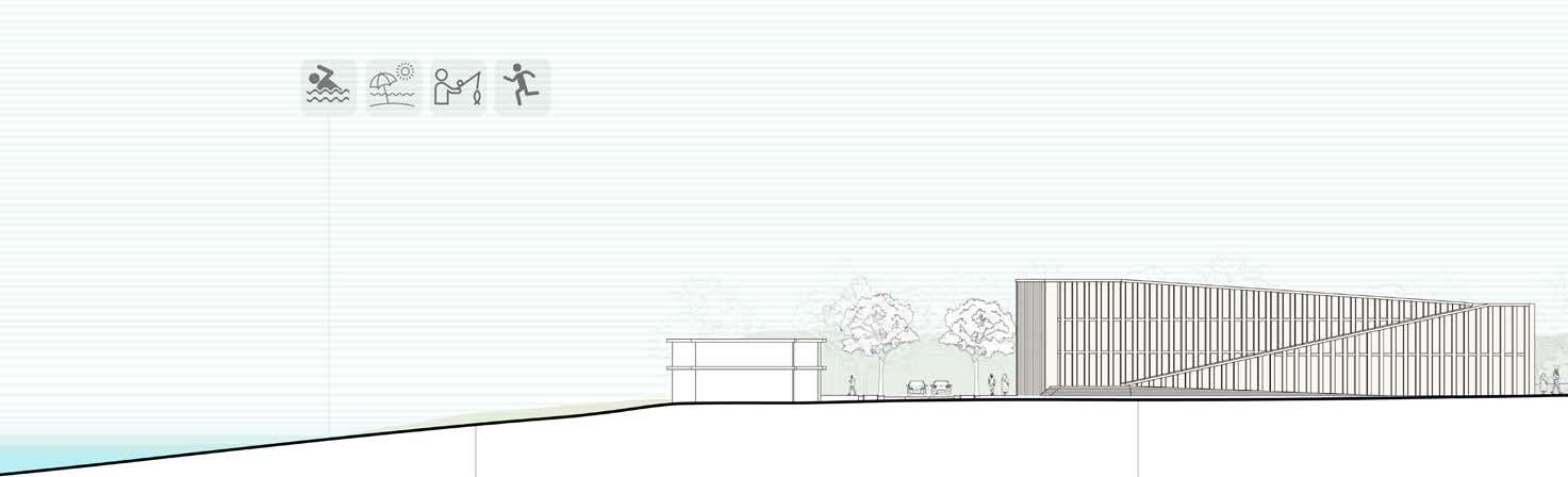 Once in the residential area, the streetscape is composed of contemporary, Timber frame homes that emulate the retreat of a summer cottage, shaded by preexisting local greenery. The mobility was further optimized through the strategic placement of the marina and the walking paths so that all visitors can be naturally guided towards the community hubs. Some of the hubs on the site include a community beach, a commercial street of pop up shops, a library, and enhanced, outdoor recreational spaces. Essentially, promoting healthier lifestyles, improved social engagement, and symbiosis with the natural realm.