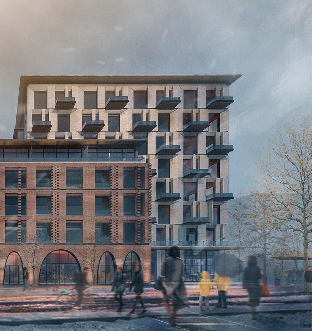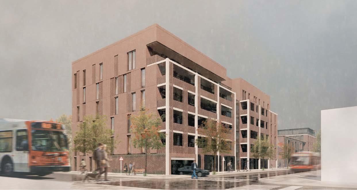 Brick Commons aims to be a housing community that accommodates a wide range of age groups and abilities. The project consists of two mid-rise buildings: ‘Building A’ located on Montreal Road, which serves as a mixed-use space, and ‘Building B’ situated along Lévis Avenue. The project is part of a larger call for urbanization and repurposing of the Vanier neighborhood to a vibrant and inclusive space for artists.