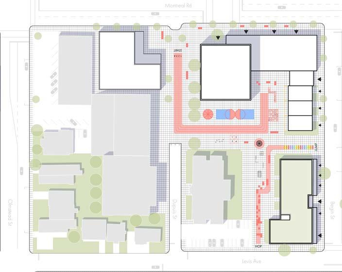‘Building A’ features commercial spaces, as well as film and music studio spaces. The prominence of brick within the project is heavily influenced by the surrounding buildings along Montreal Road and within the greater community. The durability and ubiquity of brick and stone masonry allows for a cost-effective group of buildings that are able to withstand the realities of play.