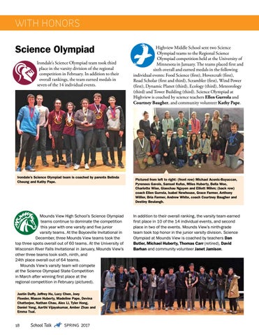 WITH HONORS Science Olympiad Irondale’s Science Olympiad team took third place in the varsity division of the regional competition in February. In addition to their overall rankings, the team earned medals in seven of the 14 individual events.