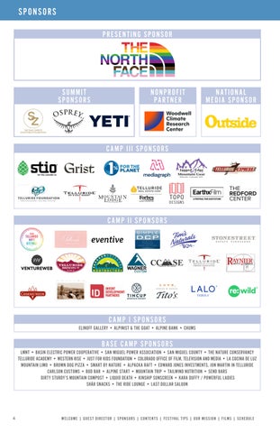 • JUST FOR KIDS FOUNDATION • COLORADO OFFICE OF FILM, TELEVISION AND MEDIA • LA COCINA DE LUZ MOUNTAIN LIMO • BROWN DOG PIZZA • SMART BY NATURE • ALPACKA RAFT • EDWARD JONES INVESTMENTS, JON MARTIN IN TELLURIDE