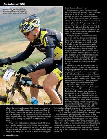 by the fast start; I know I was. But that’s not saying my finish time would have been much different with a more pedestrian beginning to the race. Five or 10 minutes, perhaps, but maybe not. The same can be said for Shriver, Alex Grant and Zanni, the riders who ultimately filled out the top five. In fact, without spending himself in the beginning, I’m pretty certain that Shriver was the second strongest guy out there. He rode at the front for nearly half the race, had some technical issues that slowed him down and was just 10 minutes behind me at the finish. A very good ride, indeed! Next year? I guess you never want to say never, but with lots of athletes oscillating on being done or not and getting plenty of heat for it, you’ve at least got to be a little careful with what you say. Higher priority goals for me now will be working to promote healthy, trail-based exercise and fitness through the nonprofit I founded in 2006, Gunnison Trails. One of our most ambitious goals is to build an epic singletrack connecting Crested Butte and Gunnison. We have tons of citizen support but gaining approval for a trail like this makes winning the Leadville 100 look like a kiddy car ride. With that in mind, I’ll say that my days of trying to win the Leadville 100 are behind me. Conjuring up the kind of fitness it takes to be competitive, especially at 45 years of age, is really difficult, and this says nothing of the time it takes away from my family and other pursuits. Right now, and this could certainly change, I see myself picking up my No. 2 plate next August and taking my position on the front row. I’ll race the 2010 Leadville 100 with whatever fitness I happen to have, but I won’t be “training” for it. I’ll be camping with the family, hopefully bagging some fourteeners, not planning or tracking what I’m doing on the bike, not worrying about even riding my bike if it doesn’t fit into our plans. With all that being said, I still love riding my bike and while I wouldn’t be going out and doing intervals, Brian Riepe structured training or the TransAlp Stage Race like I did this year, I will hopefully still be logging plenty of saddle time, doing epic rides, morning rides, evening rides, family rides. Some things just won’t change. If I’m in good shape and feeling confident, this might mean a fairly serious race, perhaps gunning for a top 10. A fairly serious race means going as hard as my fitness will allow the whole way; racing with whoever happens to be close, likely a few notches below what I have been doing. If I’m not in great shape, I’ll be looking to just finish the race. That’ll mean taking my time, looking around and riding within myself. And I’ll finally be able to answer this nagging question that I’ve had all these years: is there really an omelet chef at the Twin Lakes aid station?
