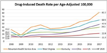 Substance use, including alcohol, prescription drug use, and illicit drug use, can exacerbate underlying behavioral health problems, and create stress and anxiety for the individual using substances, as well as their families. Substance use disorder, including overdose, is above national levels in the Mountain Health Service Area. The 2017 drug-induced death rate per age-adjusted 100,000 is 82.2, compared to the national rate of 22.8.