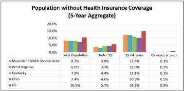 Health and social indicators within the Mountain Health Service Area indicate opportunity to significantly impact the health and well-being of residents of all ages. The median income of residents is lower than state and national benchmarks, and approximately 1 in 5 people and 1 in 4 children live in poverty. Poverty percentages among racial and ethnic minorities are consistently higher than the nation. Unemployment in the area is similar to the nation, but the workforce participation percent in West Virginia (51%) is the lowest in the US (60.4%), indicating larger numbers of working age adults who are not engaged in work. Fewer than 20% of adults across the service area have earned a bachelor’s degree.