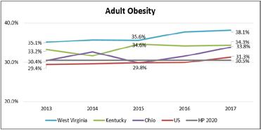With a community level view of data, we can see more clearly the areas and populations on which to focus health improvement efforts. Residents in the counties of Johnson, KY; Lawrence, KY; Martin, KY; Gallia, OH; Scioto, OH; Cabell, WV; Logan, WV; Mingo, WV; and Wayne, WV; experience more socioeconomic challenges that consistently carry through to health measures. Individuals and families in these communities experience higher chronic disease and risk factors, more behavioral health needs, poorer birth outcomes, and lower life expectancy.