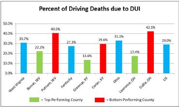 Alcohol consumption is widely accepted, which can also lead to abuse. About 1 in 10 adults in West Virginia and Kentucky and 1 in 5 adults in Ohio self-report excessive drinking, an increase from previous years. Approximately one-third of driving deaths in Ohio are due to DUI, exceeding the national benchmark. The percent of driving deaths due to DUI in West Virginia and Kentucky is only slightly lower at 30.7% and 27.3%, respectively.