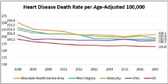 prevention and management. Residents have greater risk factors for disease and, overall, experience more chronic diseases. While more residents have health insurance and the area is better served by primary care providers overall, all 23 service counties, except Putnam, have at least one Health Professional Shortage Area. Life expectancy in the region is lower than the nation, particularly among West Virginia service counties. There are higher death rates due to heart disease, diabetes, and respiratory disease, pointing toward a lack of adoption of preventive screenings by residents. The area also has higher rates of suicide and drug-induced deaths.