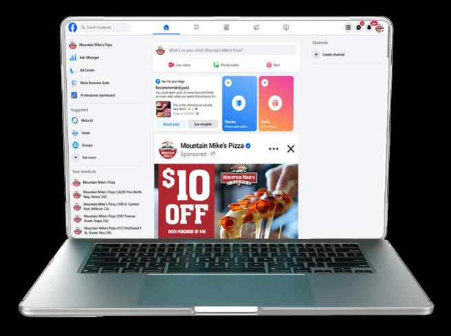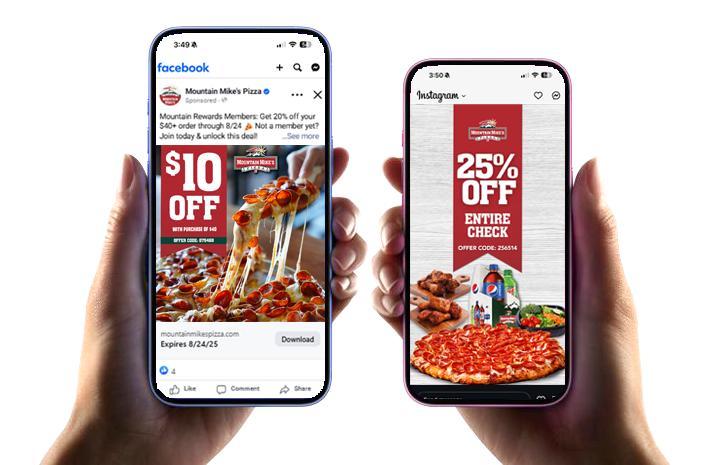 Paid social media ads, funded by your COOP or IOG, are designed to attract new customers by targeting people around each Mountain Mike’s Pizza restaurant based on their location, demographics, and interests, encouraging them to visit and make a purchase.
