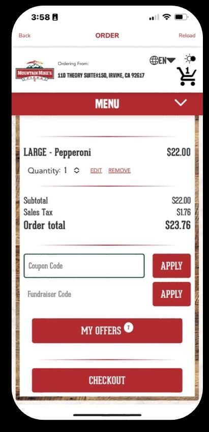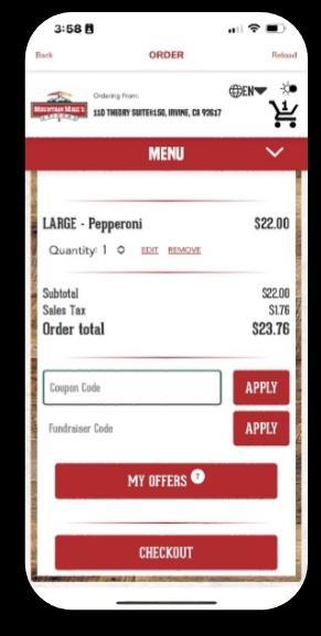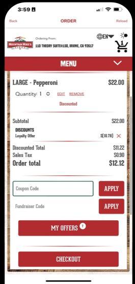 • When ordering, ensure the guest has selected eligible item(s), then at checkout, select MY OFFERS, find the offer and tap click REDEEM.