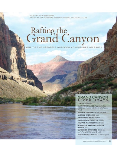 LENGTH: 278 miles ELEVATION CHANGE: Approximately 2,200 feet (varies with the level of Lake Mead) AVERAGE GRADIENT: 8 feet per mile AVERAGE WIDTH: 300 feet NARROWEST WIDTH: 76 feet MAXIMUM WATER DEPTH: 110 feet AVERAGE WATER DEPTH: 35 feet NUMBER OF RAPIDS RATED 6 OR HIGHER: 28 NUMBER OF CAMPSITES: 225 (from Lee’s Ferry to Diamond Creek) AGE OF OLDEST ROCKS: 1.8 billion years
