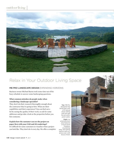 Relax in Your Outdoor Living Space MB PRO LANDSCAPE DESIGN EXPANDING HORIZONS Business owner Michael Burns took some time out of his busy schedule to answer some landscaping questions. What common mistakes do people make when considering a landscape specialist? They don’t do their research thoroughly enough about the contractor they’re going to hire. What are their capabilities and their experience? You can find out a lot by seeing the quality of their work, so ask for some addresses and go take a look at the properties before you hire someone. Explain how the customer can see the project on paper first with your CAD and 3D renderings? It’s difficult for some customers to visualize what a project can look like. They don’t do it every day. We offer a complete