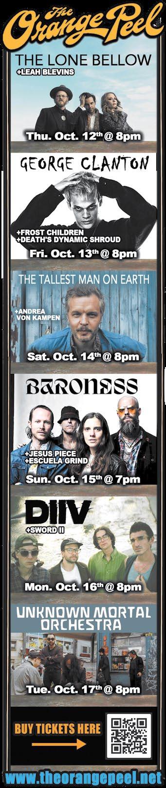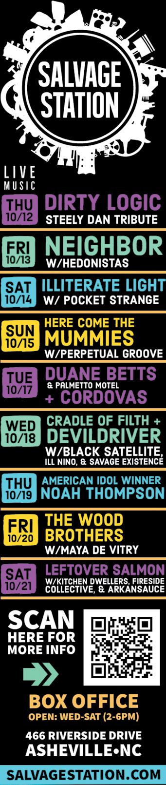 7pm THE STATION BLACK MOUNTAIN Mr Jimmy (blues), 5pm URBAN ORCHARD Trivia Thursday, 7pm WNC OUTDOOR COLLECTIVE Trivia, 6:30pm CLUBLAND WHERE YOUR DRINK SUPPORTS THE ARTS OPEN DAILY • 828.505.8118 • 268 Biltmore Ave • Asheville, NC ASHEVILLEKAVA.COM SUN: Aaron “Woody” Wood & Friends 7pm MON: Ping-Pong Tournament 7pm TUE: Open Jam w/ house band the Lactones 8pm WED: Poetry Open Mic AVL 8:30pm/8pm signup 10/20 FRI MUNICIPAL SURF GROUP, 9pm 10/14 SAT SCARY MOVIE NIGHT, 8pm 10/13 FRI CHRIS COOPER, JON PRICE & CALEB BEISSERT TRIO, 9pm 20% off One Item Expires October 31st Largest inventory selection in Western North Carolina for over 25 years Thousands of items to choose from 2334 Hendersonville Rd., Arden, NC 828-684-8250 Open 9-11pm Every Day Adult Superstore Making Fall Freakier since 1998