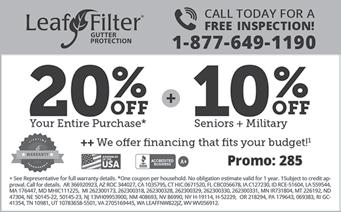 ELIMINATE GUTTER CLEANING FOREVER LeafFilter, the most advanced debris-blocking gutter protection. Schedule a free LeafFilter estimate today. 20% off entire purchase. Plus 10% Senior & Military discounts. Call 1-877-6491190. (NC Press)