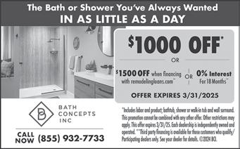 BATH & SHOWER UPDATES in as little as one day. Affordable prices - No payments for 18 months! Lifetime warranty & professional installs. Senior & Military discounts available. Call: 1-877-560-1844. (NC Press)