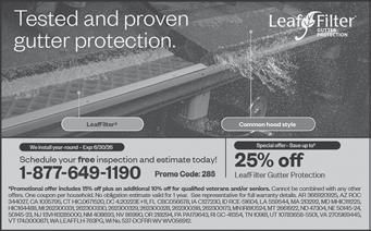 NO MORE CLEANING OUT GUTTERS. GUARANTEED! LeafFilter is the most advanced gutter protection for your home, backed by a no-clog guarantee and lifetime transferable warranty. Call today 1-877-649-1190 to schedule a FREE inspection and no obligation estimate. Plus get 20% off! Seniors and military save an additional 10%. Restrictions apply, see representative for warranty and offer details. (NC Press)